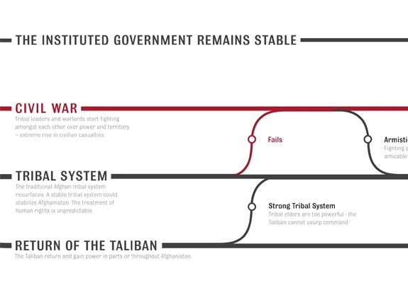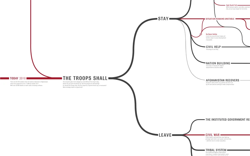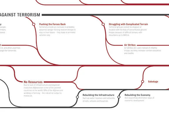The Afghan Conflict, ist ein 164x90cm Poster welches potentielle Zukunftsszenarien und deren Zusammenhänge des Afghanistan Krieges visualisiert.