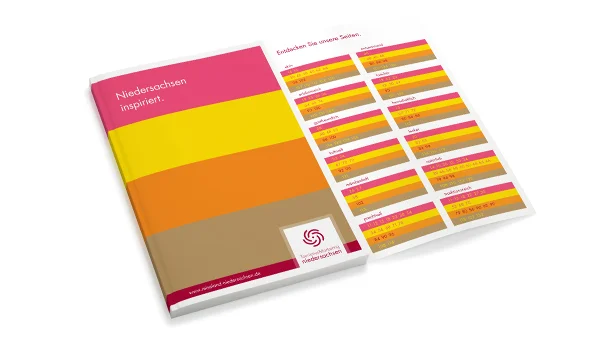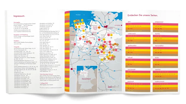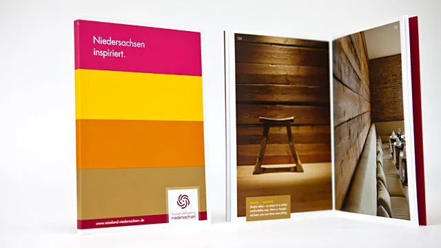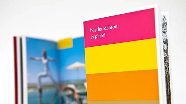 Niedersachsen für Einsteiger: Ein farbenfrohes Bilderbuch im Taschenformat zeigt die vielen Facetten des Reiselandes Niedersachsen. KONO konzipierte, gestaltete und realisierte die 136 Seiten starke Publikation, die 2009 in deutsch und englisch erschien. Im Buch werden Reiseideen nach Jahreszeiten sortiert und in der Inspirationskarte verortet.