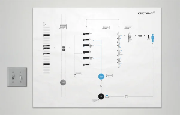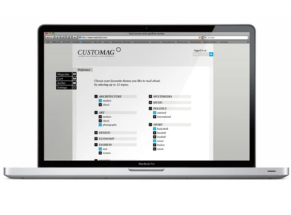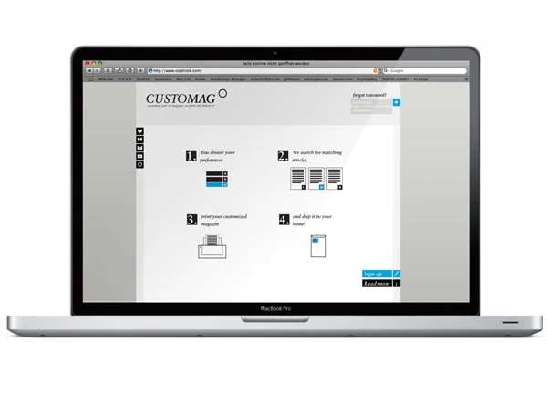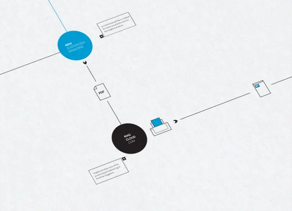 Der User müsste sich lediglich online ein Konto anlegen und seine Vorlieben und Interessen angeben. Aus den Vorlieben und den vorhandenen Artikeln filtert ein Programm die bestmöglichen Übereinstimmungen heraus und setzt so den passenden Inhalt für das Magazin des Users zusammen. In einem InDesign-Template werden die Beiträge in ein einheitliches Layout gebracht und als PDF exportiert. Die so erschaffene Datei wird an den Server von Magcloud.com weitergeleitet, dort gedruckt und sofort an den User verschickt.