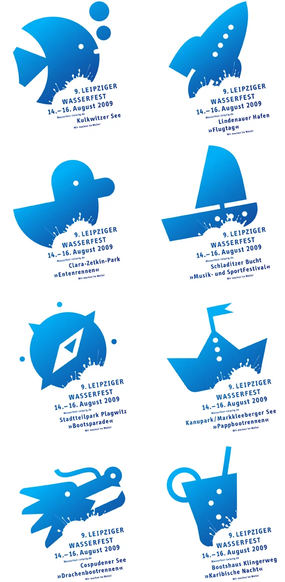 Für das 9. Leipziger Wasserfest haben wir, basierend auf Piktogrammen für die einzelnen Erlebnisorte, ein ganzheitliches Erscheinungsbild für die Veranstaltung und alle zugehörigen Veranstaltungsmedien erstellt.