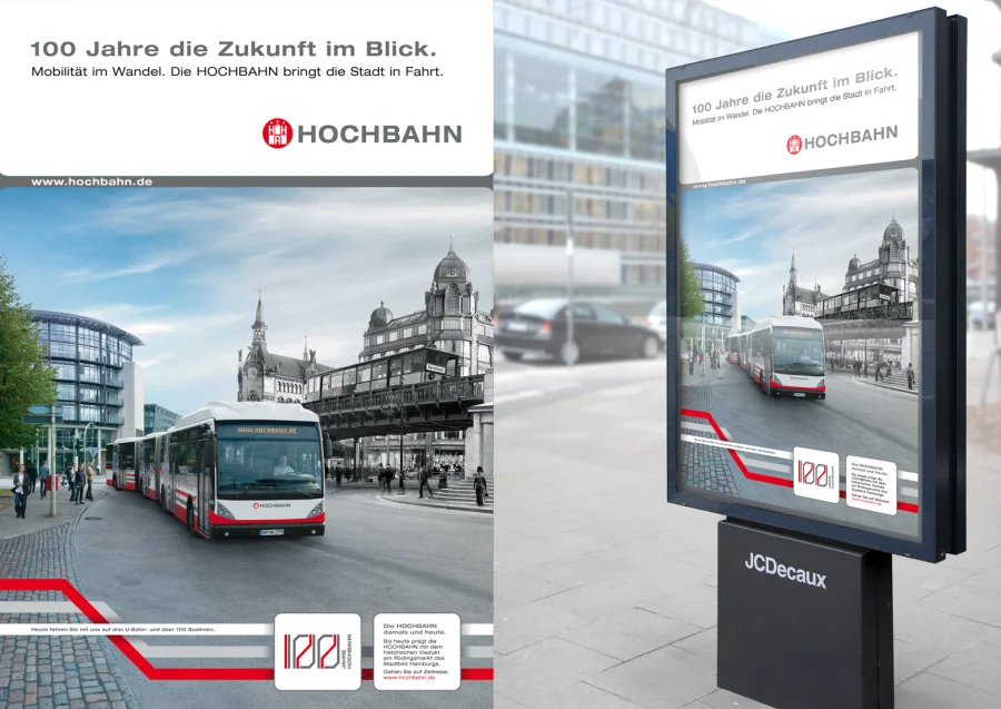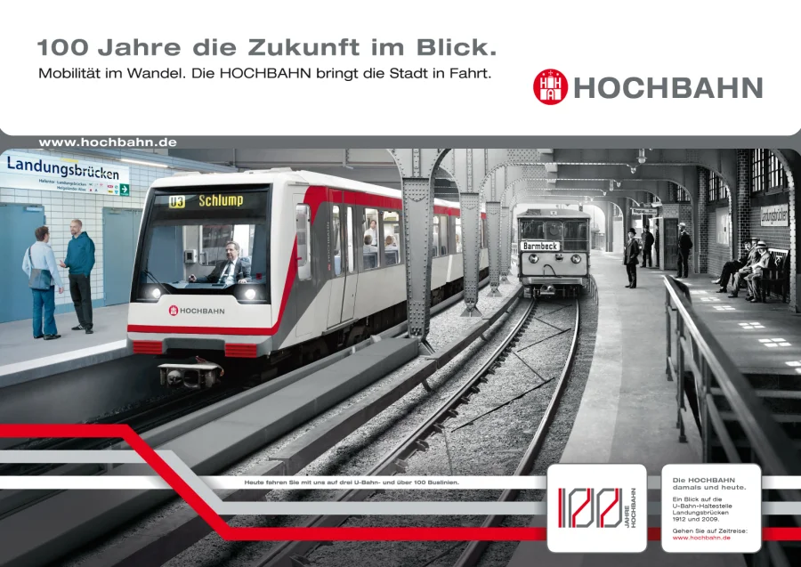 Von 1906 bis 1912 baute die Hochbahn AG Hamburgs erste U-Bahn. Orange Cube entwickelte eine sechsjährige Jubiläumskampagne, die über den Zeitraum von 2006 bis 2012 sechs Schwerpunktthemen beleuchtet. In der Marktforschung ist die Werbung ein Riesenerfolg.