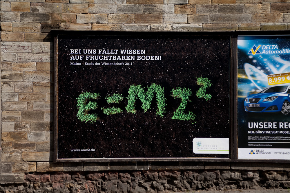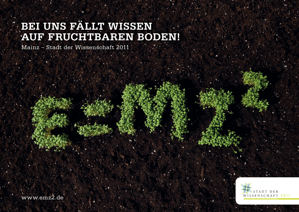 “E=MZ². Bei uns fällt Wissen auf fruchtbaren Boden. Die bekannte Formel Albert Einsteins, E=mc², steht wie keine andere stellvertretend für Wissenschaft. Dies haben wir uns zu nutze gemacht und sie mit Mainz zu einer neuen, einzigartigen Formel für die Stadt der Wissenschaft 2011 fusioniert: E=MZ².