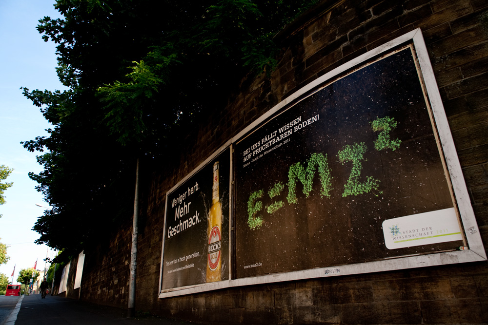 Ziel war es, für die Stadt Mainz eine Plakatkampagne zu entwickeln, welche die Bevölkerung darüber informieren soll, dass Mainz zur “Stadt der Wissenschaft 2011” gewählt wurde. Vom Briefing durch die Stadt Mainz am 19. April bis zum Pitch am 17. Mai, vergingen gerade mal vier Wochen. Es nahmen sechs Gruppen mit mehr als 20 Kampagnenideen teil. Entschieden hat sich die Jury aus Vetretern von Stadt, Ströer, FH, Uni, … nach eingehender Beratung für unseren Vorschlag “E=MZ²”. Ab 11.06. hing dann für zehn Tage, an ca. 50 Standorten in Mainz unser Motiv als 18/1 Großflächenplakat.