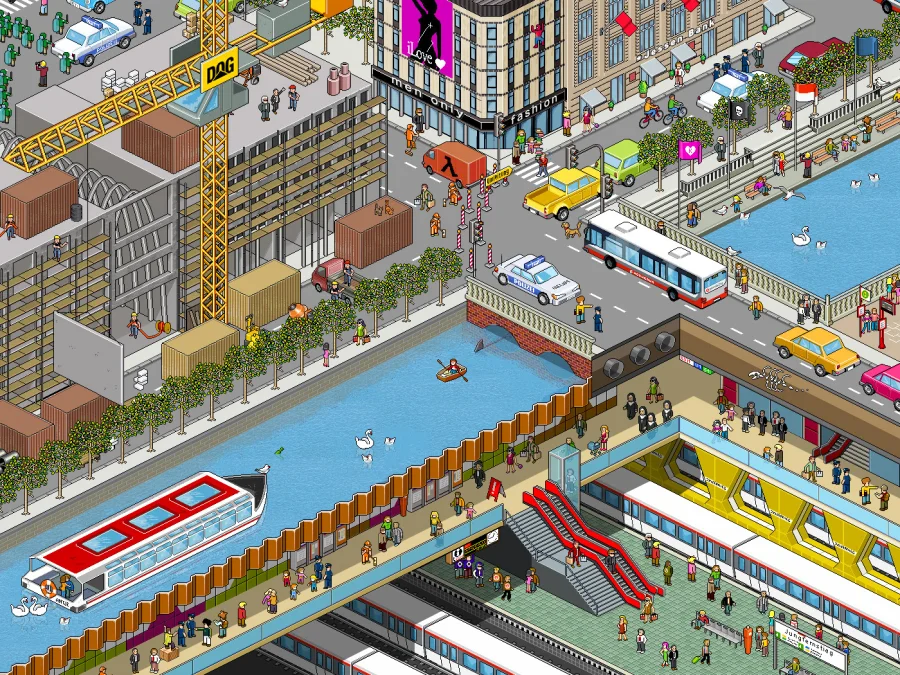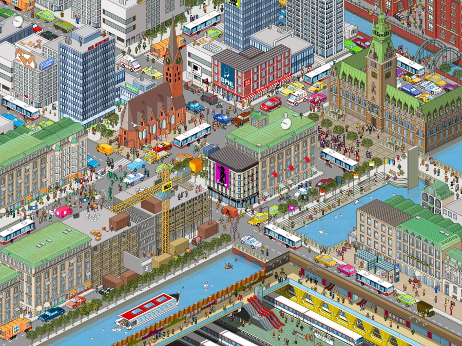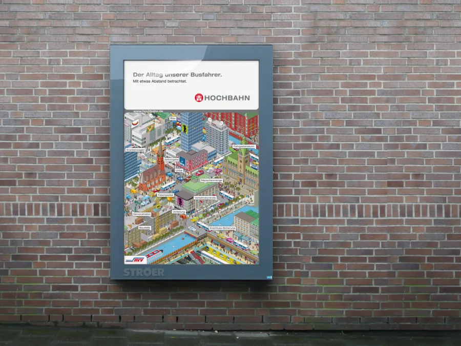 Um Fahrgästen den schwierigen Alltag der Busfahrer charmant näherzubringen, haben wir die Hamburger Innenstadt aus der Vogelperspektive Klick für Klick nachgezeichnet und mit typischen Verkehrssituationen ergänzt. Etwa 50 Millionen Pixel wurden von Hand gesetzt. Die Plakate blieben über Wochen Kult.