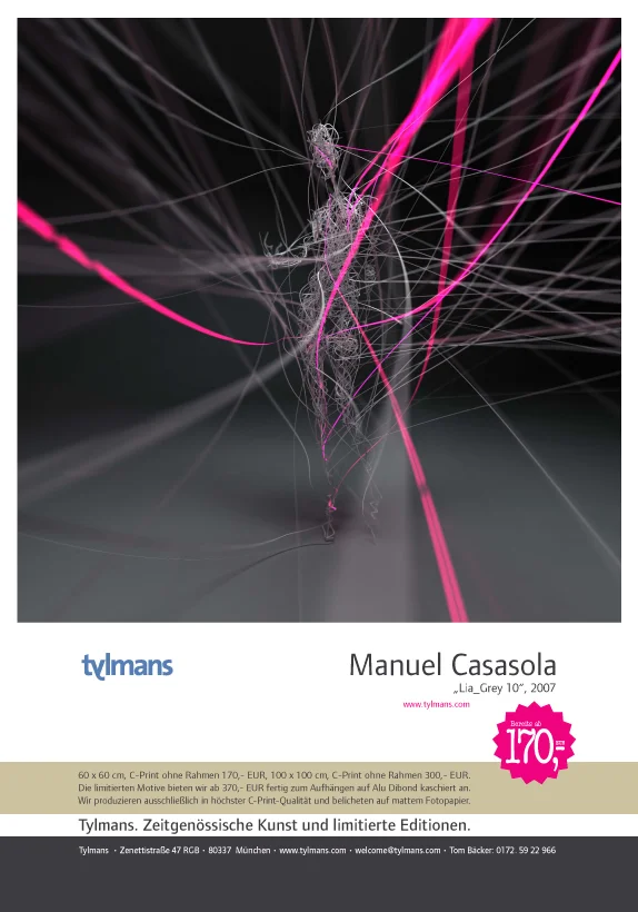 Für die Galerie tylmans haben Martin Kett und Tom Bäcker eine Plakatserie entwickelt, die an Orten mit kunstinteressiertem Publikum platziert wurden. Dabei achteten wir darauf, das das künstlerische Motiv nicht von Informationen oder dem Logo verdeckt wurde. Artists: Manuel Casasola, Peter Pedall