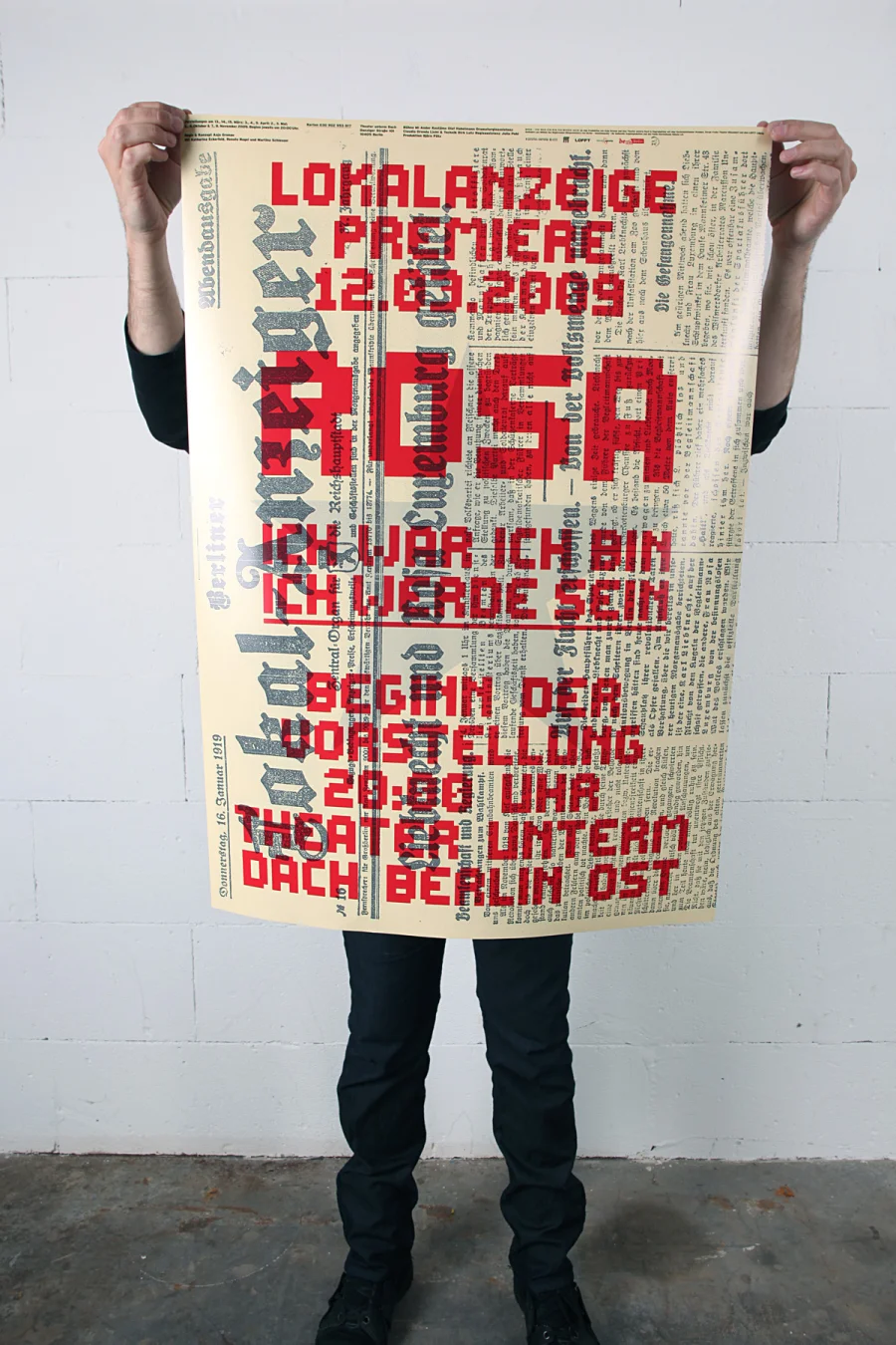Das Plakat warb für die Inszenierung »ROSA – ich war, ich bin, ich werde sein« der Regiesseurin Anja Gronau als Produktion des »Theater unterm Dach« in Berlin. Digitale Typografie mit der aktuellen Information siebte sich über das im Querformat gesetzte Titelblatt des »Berliner Lokalanzeiger« vom 16. Januar 1919. Der Lokalanzeiger berichtete damals tagesaktuell vom gewaltsamen Tod Rosa Luxemburgs und Karl Liebknechts in der Abendausgabe. Das Plakat ist Sublimation der Person im heute und jetzt und Rückblick auf das Vergangene mit Link in die Zukunft. Fakt und Aufruf, transformiert in ein durchdringend dringlich aktuelles Blatt der Aussage: »Ich war, ich bin, ich werde sein…«.