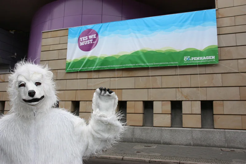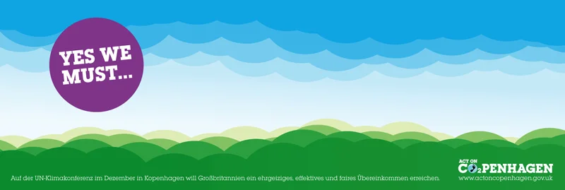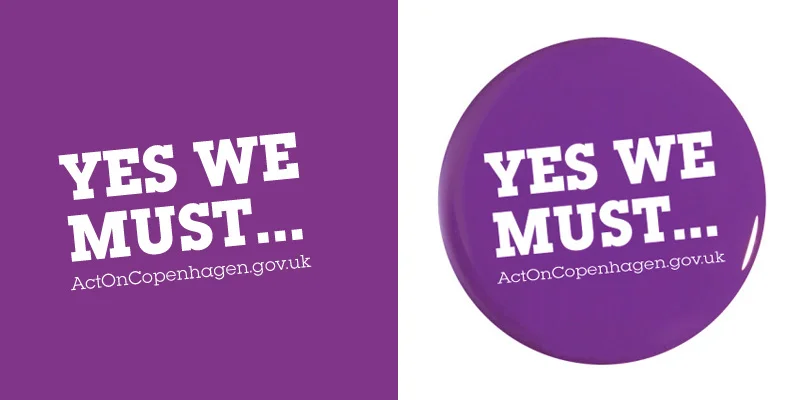 „Yes we must… act on Copenhagen“ war die Botschaft Großbritanniens an die deutsche Bevölkerung, für die erstmalig die Fassade der britischen Botschaft in der Wilhelmstraße / Berlin als Kommuniktionsfläche genutzt wurde. An ausgewählten Tagen wurden vor der Botschaft violette Buttons verteilt.