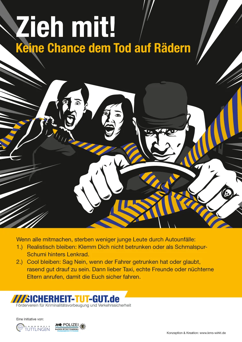 Einfache, aber spannende Darstellung von gefährlichen Situationen für eine überwiegend jungen Zielgruppe, die zum Mitmachen, bzw. zu einem bestimmten Verhalten motiviert werden soll. Illustyle, um das schnelle Verständnis der gezeigten Situation zu fördern, ohne den oft bei Sicherheitskampagnen üblichen erhobenen Zeigefinger einzusetzen. Das Band in den Farben des Landkreises Tuttlingen symbolisiert ein Sicherheitsband, durch ziehen daran wird die Gefahr gebannt.