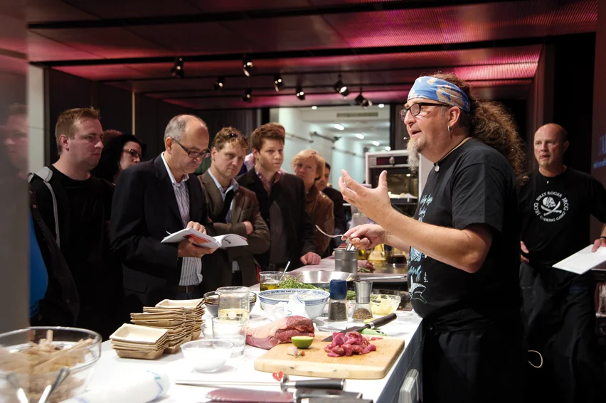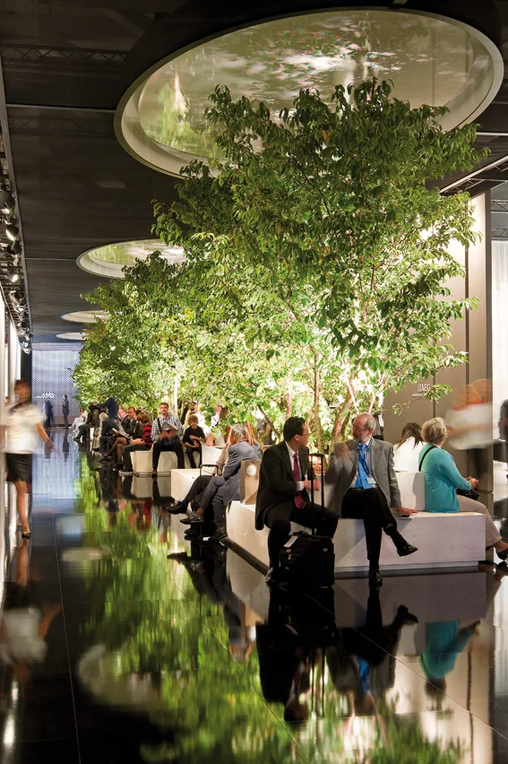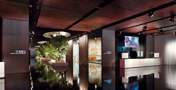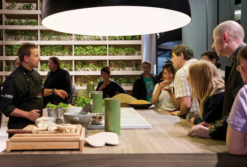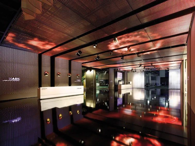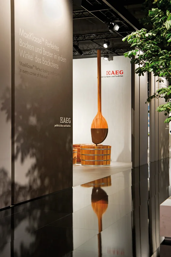 Über zwei große Eingangsportale gelingt der bewusste Schritt in die Markenwelt von Electrolux. Die räumliche Hülle der Halle unterstützt die in sich geschlossene Markenwelt auf über 3.100 qm. Von der Hektik der Messe abgeschirmt eröffnet sich dem Besucher hier ein weitläufiges Entrée, das Herzstück des Markenraumes. Die mediale Decken- und Wandbespielung begleitet die Besucher ins Innere der Markenwelt. Weiche Formen fließen im Rhythmus des Besucherstroms über die leuchtende Decke. Stoffbezogene, LED-hinterleuchtete Wände verstärken die multimediale Bespielung. Das Lichterspiel spiegelt sich im hochglänzenden schwarzen Boden und durchflutet so die gesamte Eingangshalle. Eine Allee aus Kastanien, Kirschbäumen und Linden eröffnet den Weg zu den einzelnen Produktbereichen. Hier wird die emotionale Markenausrichtung in Verbindung mit den Innovationen durch Materialvielfalt und bildhafte Beispiele unterstrichen: Sei es ein Wasserfall, der die Leistungen des „ProClean“-Geschirrspülers bebildert oder die mit duftendend weichem Moos bewachsene „Öko_Line“. Electrolux untersucht kontinuierlich den Wandel im Verbraucherverhalten sowie aktuelle Trends und legt besonderen Wert auf die Erkenntnisse in Produktentwicklung und Design. Diese Fokussierung spiegelt sich im Markenraum auf der IFA 2010. Die gesamte Markenwelt lädt zum Anfassen, Begreifen und Innehalten ein: warme Hölzer und weiche Materialien im Dialog mit medial bespielten Wänden visualisieren das Makeover mit inspirierenden Elementen und der entsprechenden Dynamik. Ein überdimensionales Regal voller duftender Kräuter weckt die Lust auf das Erlebnis Küche. So wird dem Live Cooking 2010 bei Electrolux noch mehr Raum gegeben: Die Starköche Stefan Marquard und Christian Mittermeier bieten ihre kulinarische Vielfalt beim Life Cooking. In den einzelnen Produktbereichen erfüllen weitere Profiköche und Patisseure den gesamten Markenraum mit duftenden, frisch zubereiteten Köstlichkeiten.
