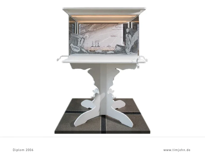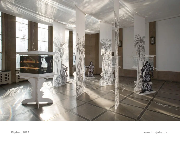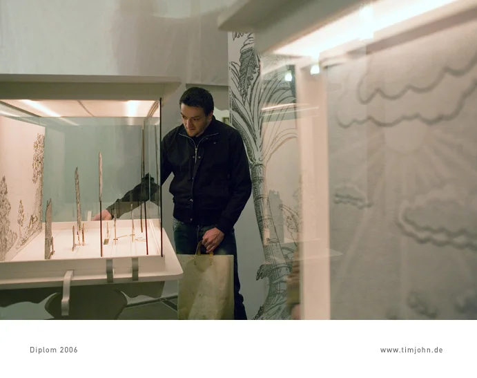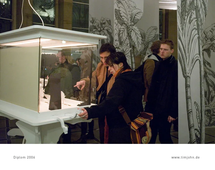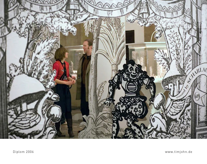 Das Thema meiner Diplomarbeit war ein Ausstellungskonzept für Papiertheater. Grundziel ist das spielerische Zusammenführen von Besuchern der Ausstellung. Dies geschieht auf 2 Ebenen. Die erste ist der Ausstellungsraum selbst, ein lebensgroßes Papiertheater, eine reine Schwarz-Weiß-Welt. Darin bewegen sich die Besucher für den Beobachter wie Schauspieler auf einer Bühne. In zweiter Ebene sind es Vitrinen an denen die Besucher auf einer kleinen Bühne hinter Glas einander spielerisch begegnen. Diese Arbeit wurde vom Altonaer Museum Hamburg 2007 gekauft und ist als Daueraustellung dort zu besichtigen.