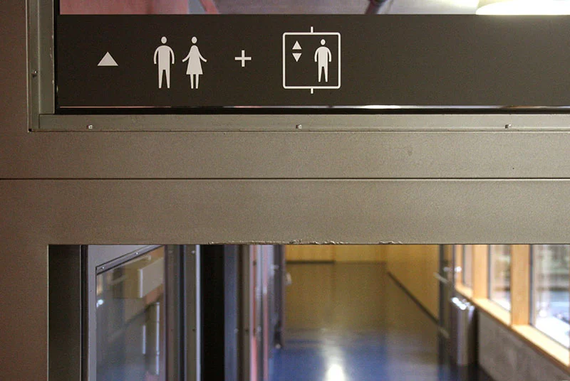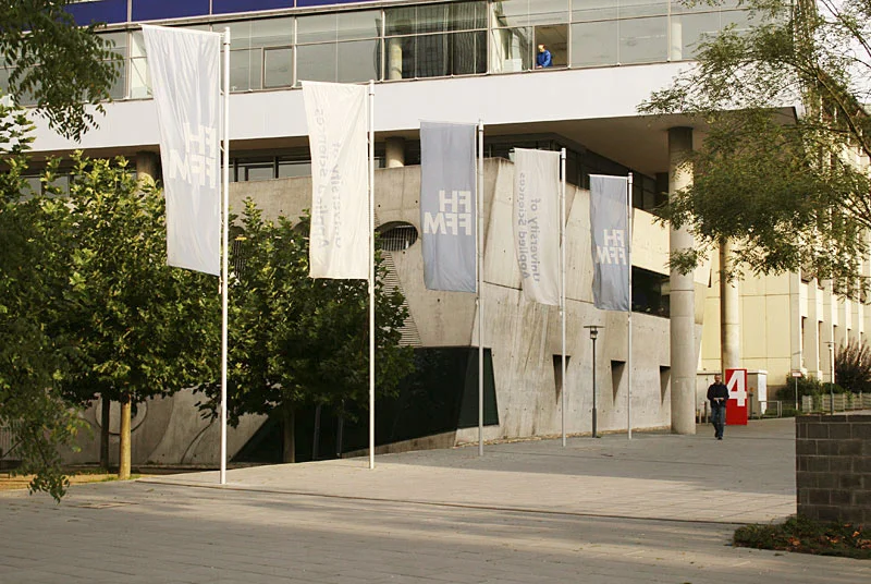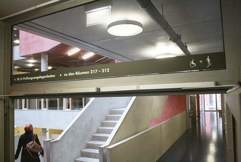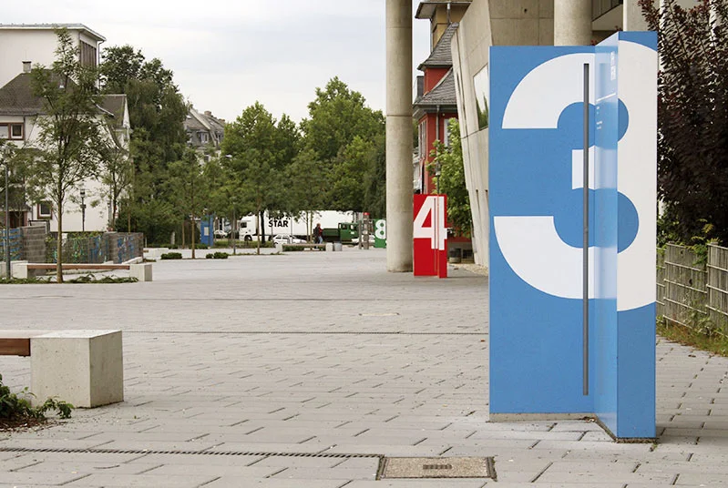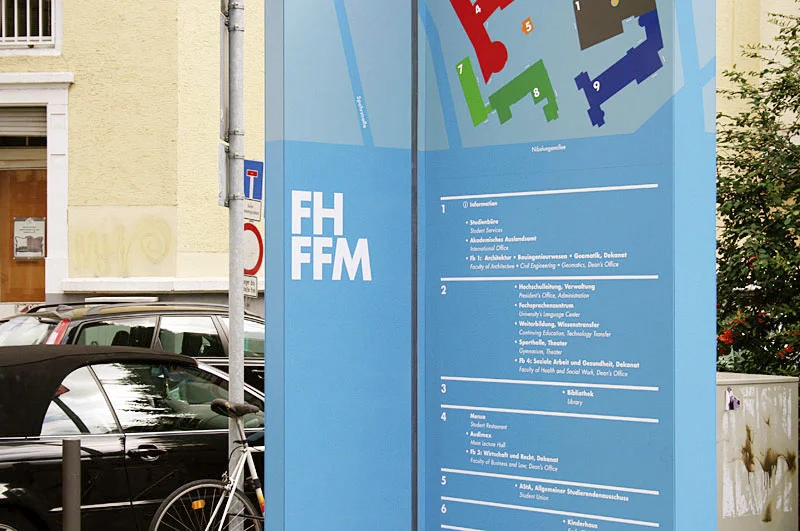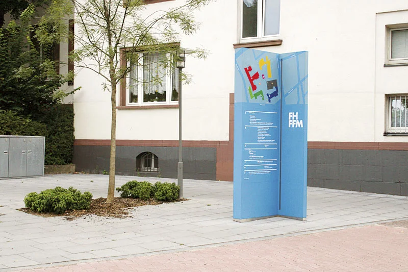 Leitsystem für den Campus der Fachhochschule Frankfurt am Main. Große farbige Stelen funktionieren als visuelle Klammer um heterogene Gelände als einen einheitlichen Campus zu fassen.