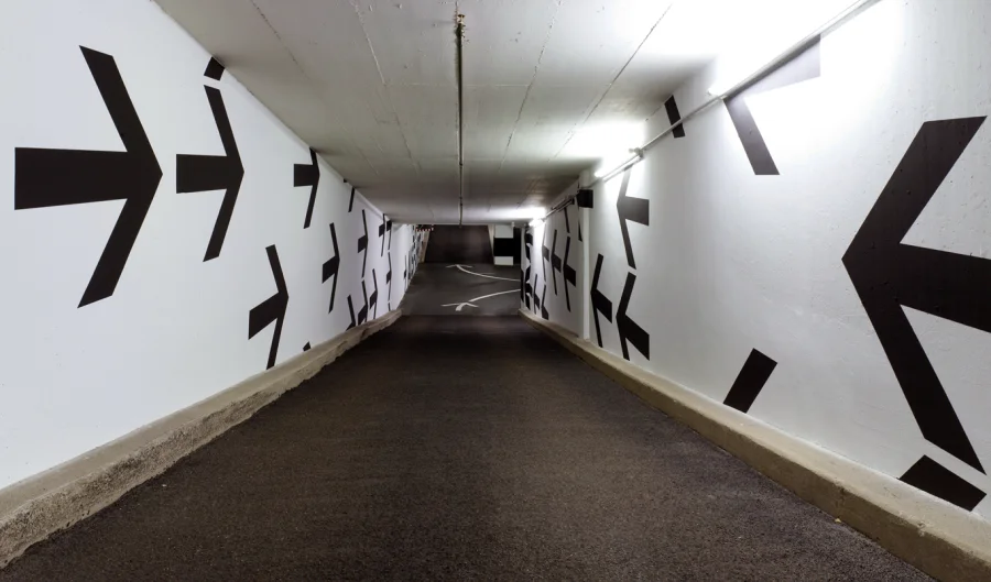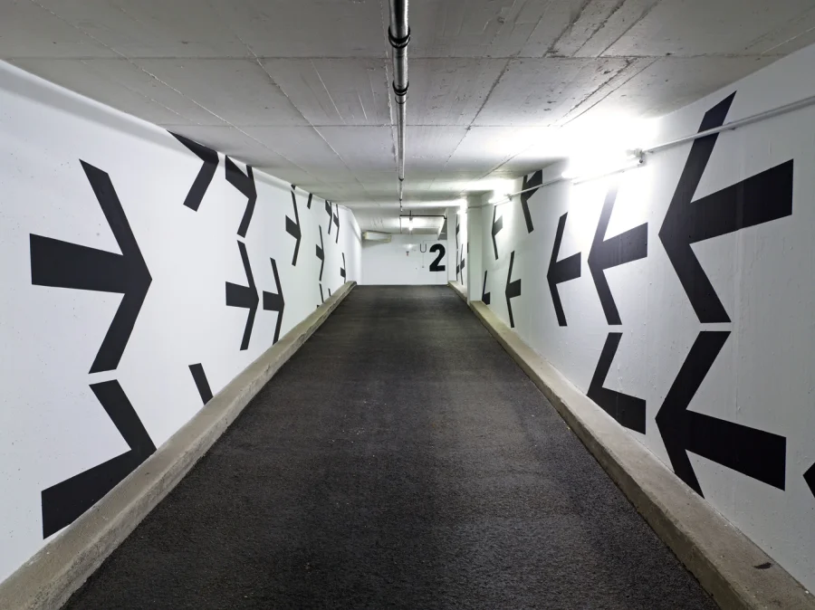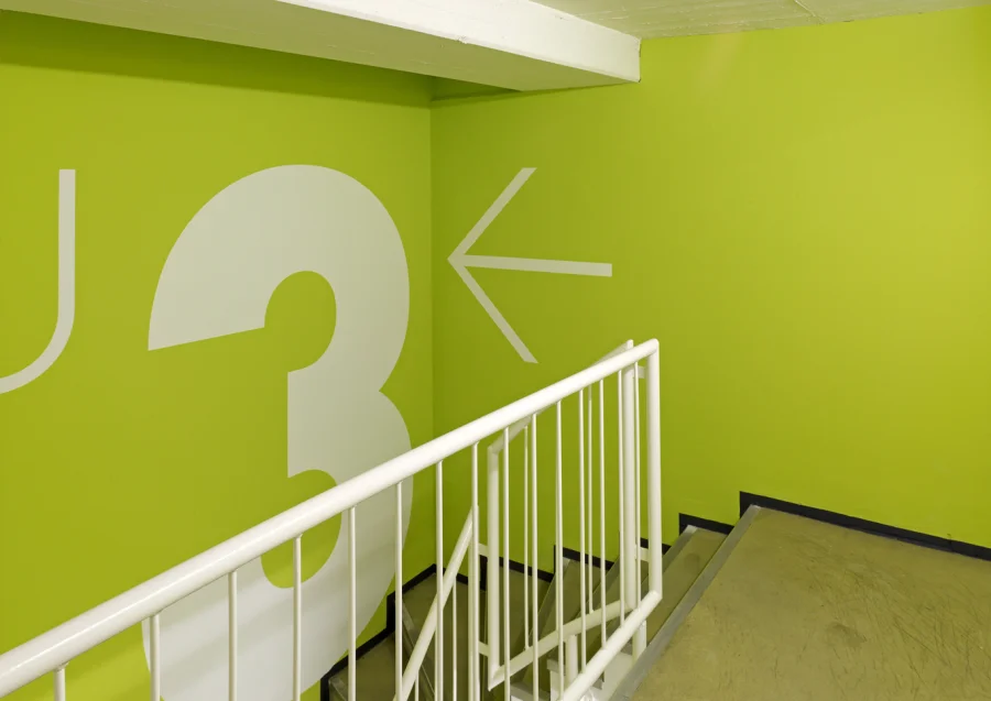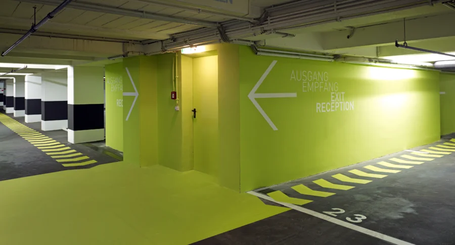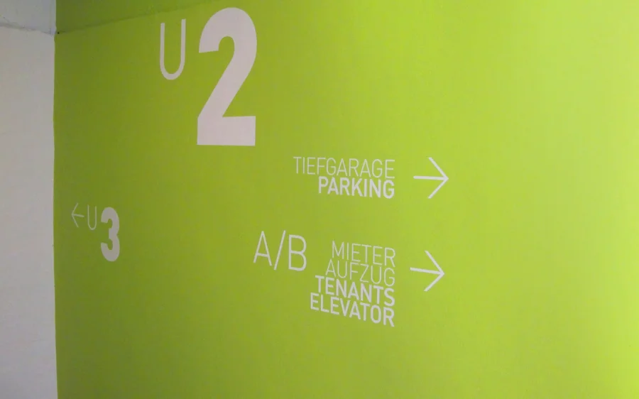 Zur besseren Orientierung in der Tiefgarage des Hochhaus am Park im Frankfurter Westend, entwickelte quandel design ein neues Leitsystem für Besucher, Kunden und Mieter Objekts. Da sich der Bestand trotz 10.000 qm Gundfläche als relativ verwinkelt und unübersichtlich entpuppte musste eine sehr plakative Wandgestaltung erarbeitet werden, die durch getrennte Fahrbahn und Fußgängermarkierungen am Boden unterstützt wird. Es entstand ein sehr einfach verständliches System aus Typografie, Pfeilen und Farbe, welches den Besucher von der Einfahrt, zum Parkplatz, ins Treppenhaus, und letztlich bis ins Foyer sicher begleitet und führt.