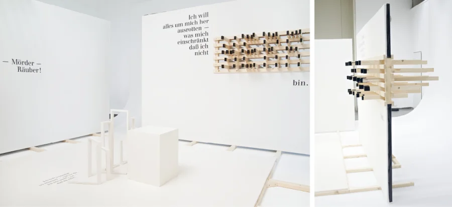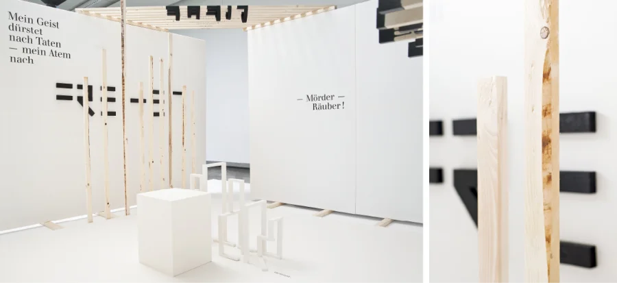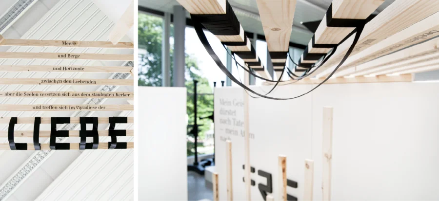 Die Hauptdarsteller sind in Form von Zitaten und typografischen Figuren im Raum vertreten und bespielen Decke, Boden und Wände.