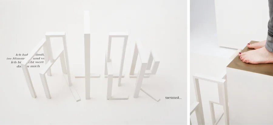 Der Raum bildet keine geschlossene Einheit, er zerfällt in einzelne Teile, genau wie die Charaktere im Stück selbst. Jeder ist auf sein eigenes Begehren konzentriert. Dies kann der Betrachter nachvollziehen, indem er einen bestimmten Blickwinkel einnehmen muss, um den figürlich inszenierten Wunsch des Einzelnen zu entdecken.