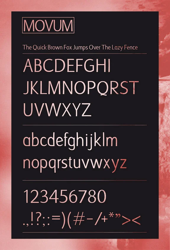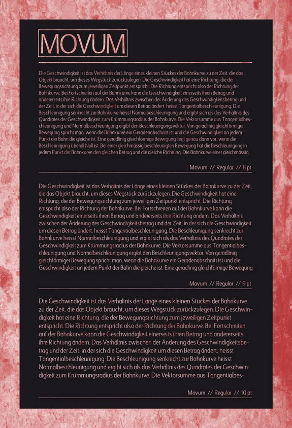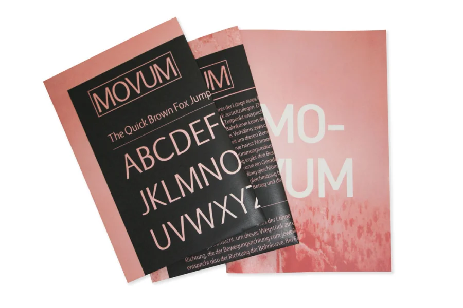 MOVUM setzt sich aus zwei Wörtern zusammen. Einmal aus dem englischen Wort für Bewegung, “movement”und zum anderen aus dem lateinische abgeleiteten Wort “Novum”, welches für Neuerung steht. Neu an der Movum ist, dass sie keine starren Geraden Aufweist sowie der leichte Stichstärken Unterschied. Dies ist eine Eigenschaft, die bisher eher untypisch für Serifenlose Schriften ist.
