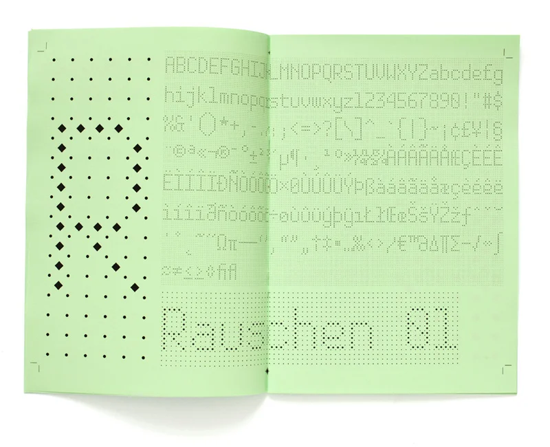 the font styles functions without the dots in the grid. this shows how successfully the individual characters of this high quality font have been optimised. the “rauschen-booklet” received the certificate of typographic excellence from the type directors club new york in 2010. the typeface has 5 different font styles and is distributed by volcano type.