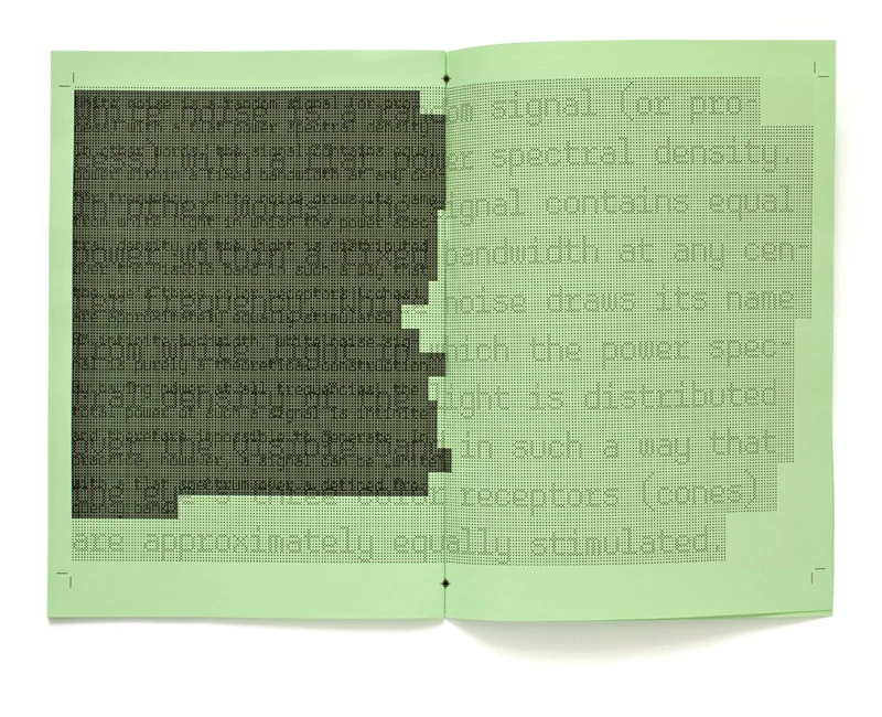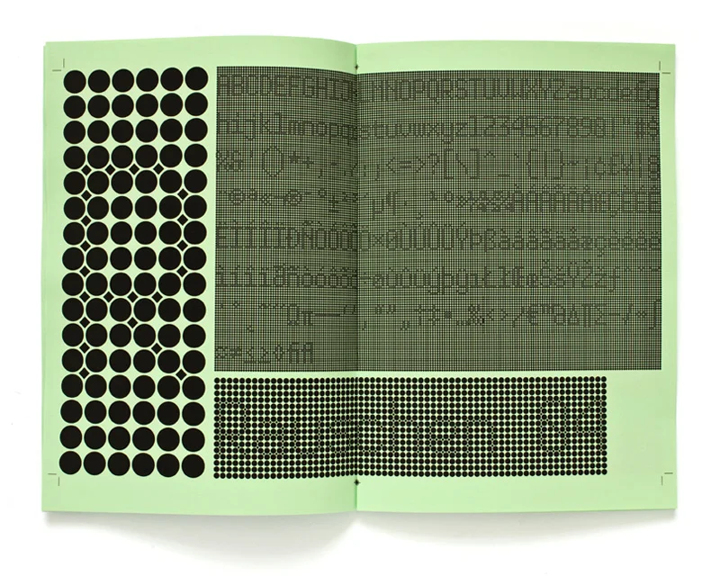 inspiration for this typeface came from the static on television screens. it has been created through the use of a modular grid system with circular dots. the individual letters, which consist of small rectangles, form part of the grid. the font style is determined by the size of the dots in the grid. the typeface attains a different form of visual white noise, depending on which font style is chosen. this in turn changes when the typeface is observed either from close range, from afar, or from the side. one of