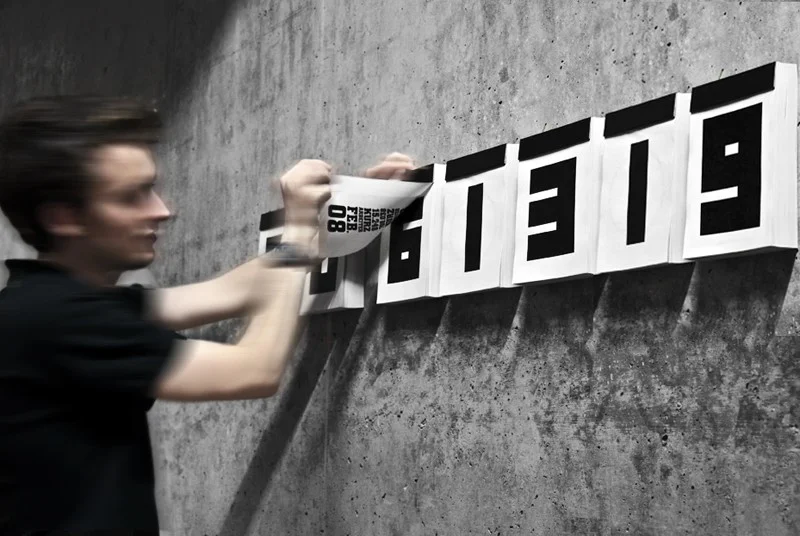 In Form eines Abreisskalenders. Besser gesagt: in Form mehrerer nacheinander geschalteter Kalender. Jeder Kalender eine Ziffer. Insgesamt ein zwölfstelliger Betrag. Und die Währung? Auch die ändert sich. Je mehr, und je schneller, der Benutzer Blätter abreißt, desto schneller ändert sich der dargestellte Betrag und die Währung.