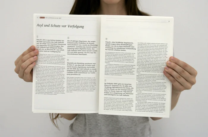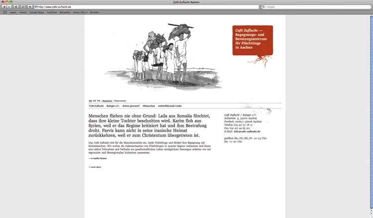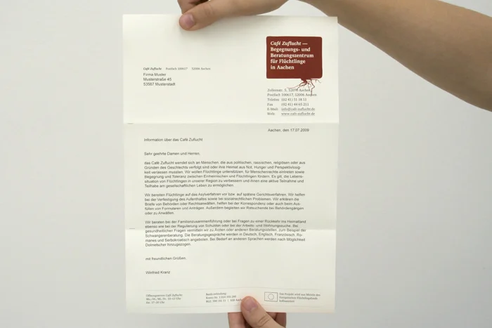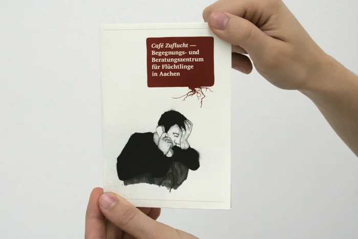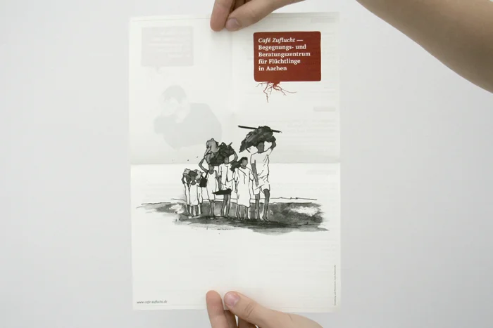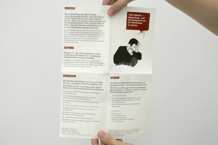 Das seit 1991 bestehende Café Zuflucht ist ein Beratungs- und Begegnungszentrum für Flüchtlinge in Aachen. Dort wird Menschen geholfen, die aus politischen, rassischen, religiösen oder aus Gründen des Geschlechts verfolgt sind oder ihre Heimat aus Not, Hunger und Perspektivlosigkeit verlassen mussten. In realer Zusammenarbeit mit der gemeinnützigen Einrichtung wurde ein visuelles Konzept für diese entwickelt, das auf Medien wie Broschüren, Webseite und Geschäftsausstattung umgesetzt werden kann. Ziel ist es vor allem, potentielle Unterstützer auf die Einrichtung aufmerksam zu machen und über ihre Tätigkeiten zu informieren, um das Projekt auch in Zukunft aufrecht erhalten zu können. Bei der Gestaltung lag daher der Fokus auf der kostengünstigen Realisation und einer klaren, einprägsamen Kommunikationslinie.