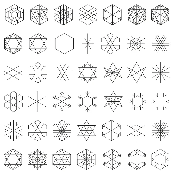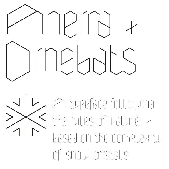 Keine Schneeflocke gleicht einer anderen – diesem Prinzip folgt Aneira Dingbats und spiegelt die Vielfalt der Musterbildung einer Schneeflocke wider. Aneira Dingbats folgt dem gleichen Rahmenraster wie auch die Schrift Aneira, jedoch variiert die Symmetrie im Innenraum des Sechsecks.