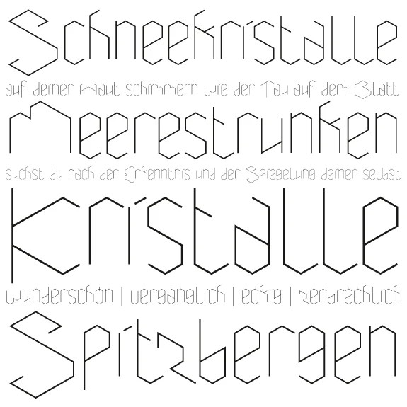 Die Schrift Aneira von Kristina Klinkmüller ist filigran, klar strukturiert, gefangen im Raster und dennoch beschwingt durch die Ungleichmäßigkeit der Grundlinie. Eine Schrift, die dem Vorbild der Natur folgt, da Aneira auf den Gesetzmäßigkeiten eines Schneekristalls basiert. Und so kommt es nicht von ungefähr, dass Aneira übersetzt im Walisischen “Schnee” bedeutet.