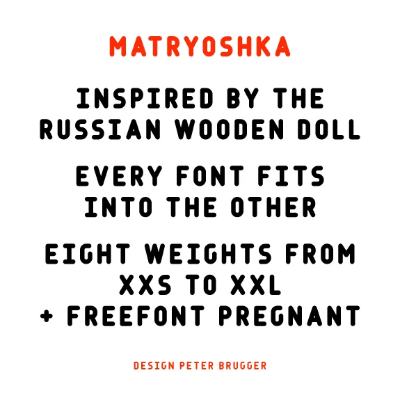 Matryoshka is a display layering type family which is inspired by the Russian wooden doll. The family contains eight different weights from XXS (thin) to XXL (fat) + Freefont Pregnant (all in one). It was designed by Peter Brugger in 2009/10.