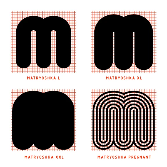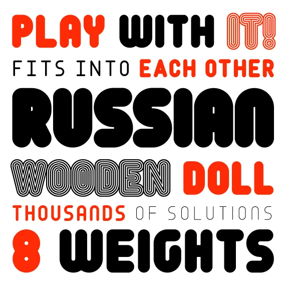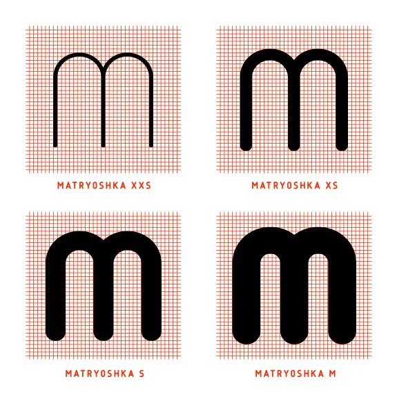The design is based on an elaborate and complex grid, so each font fits perfectly into the other. With the Matryoshka family the typographer can create millions of new solutions.