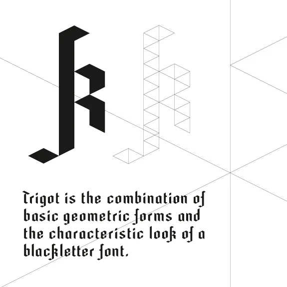 Trigot is a modular typeface. Every form and every character is constructed from the basic geometric form of the triangle. The Despite the simple construction trigot resembles strongly a gothic blackletter font. The letters are inspired by the ductus and forms of medieval typefaces and have a similar complex expression.