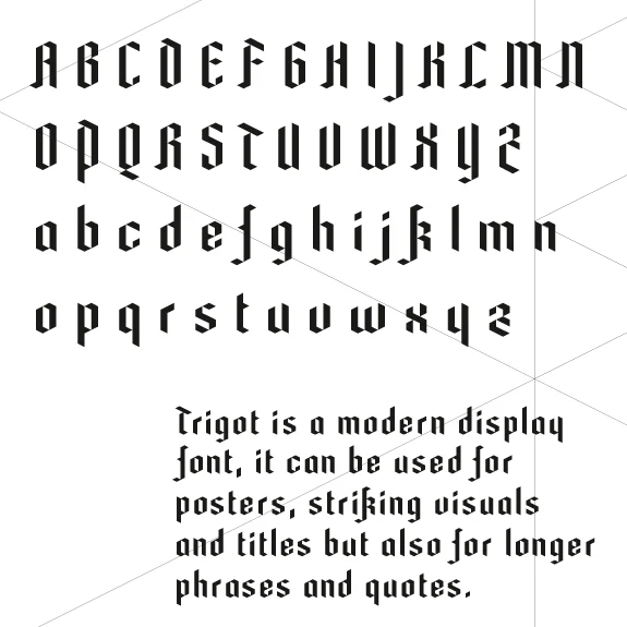 The main singularity of Trigot lies in the strong contrast between clear geometry and the complex expression of a blackletter typeface. The name “Trigot“ hints the gothic influence and the triangular modules. Trigot is a modern display font, it can be used for posters, striking visuals and titles but also for longer phrases and quotes.