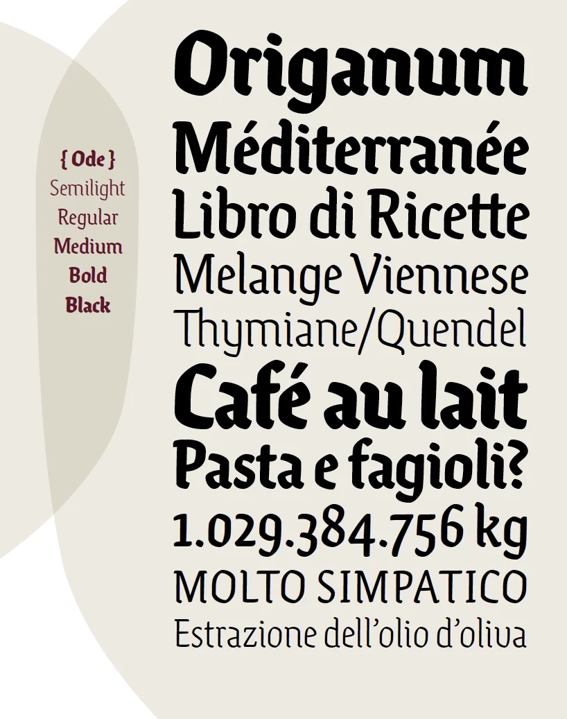 Ode ist eine lebendige Schriftfamilie in fünf Gewichten und viel Charakter. Sie ist mit allem ausgestattet, was man von einer zeitgenössischen Textschrift erwartet: umfassende Zurichtung, Ligaturen, erweiterte Sprachunterstützung und diverse Ziffernsets und sogar einem Feature für Brüche — wunderbar für’s Setzen von Rezepten.
