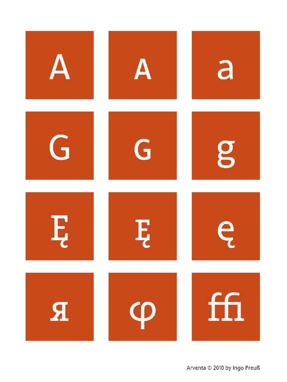 Jede Arventa Familie enthält sieben Fetteabstufungen (Thin, Light, Regular, Medium, Bold, Black und UltraBlack) jeweils zuzüglich der Kursiven. Jeder einzelne Font enthält über 1000 Buchstaben und ist gewissenhaft nach dem bewährten GTF-UNI-Standard entwickelt. Alle Fonts enthalten einen umfangreich latinischen Zeichensatz nebst Kapitälchen sowie Kyrillisch und Griechisch. Ebenso sind umfangreiche Zahlenformate (tabular und proportional), Hoch- und Tiefstellungen und Brüche enthalten, die einfach über OpenType Features anzuwenden sind.