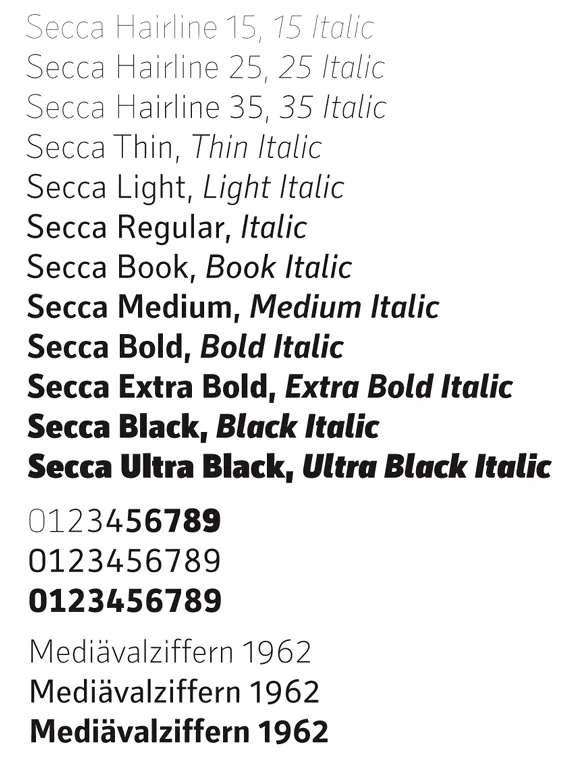 Die Secca-Familie enthält insgesammt 24 Fonts mit 12 Strichstärkenvarianten die jeweils über 940 einzelne Zeichen enthalten.