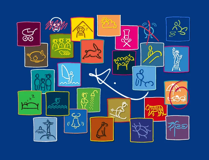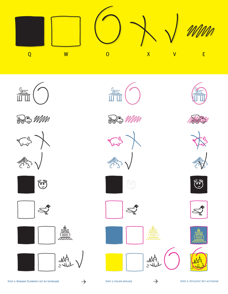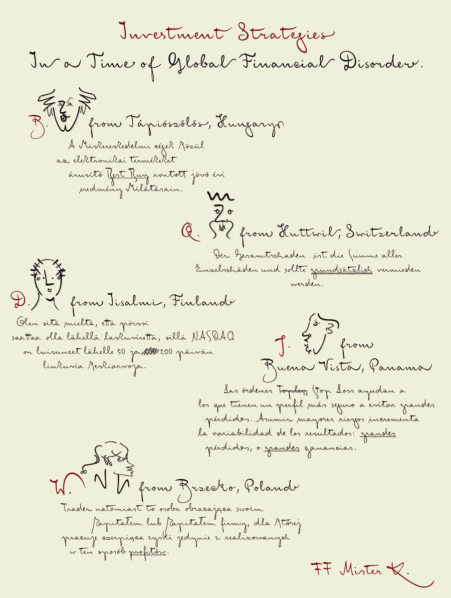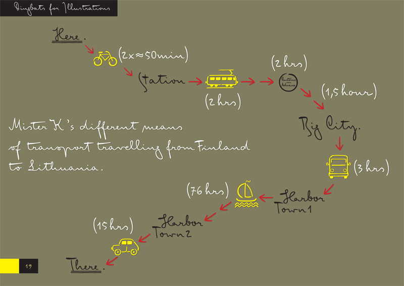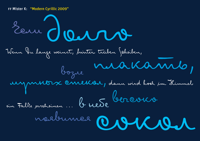 Eine durch Franz Kafkas Handschrift inspirierte Schreibschrift mit integriertem Dingbats Schnitt. Die Philologin und Designerin Julia Sysmäläinen aus Finnland (seit 6 Jahren Berlin / Edenspiekermann) beschäftigte sich zunächst sprachwissenschaftlich mit Kafkas Manuskripten und entwickelte anschließend die komplexe OpenType Schrift FF Mister K mit reichhaltigem feature code. Der Duktus der Schriftzeichen wurde im ca. 600 Piktogrammen umfassenden Dingbats Schnitt übernommen.