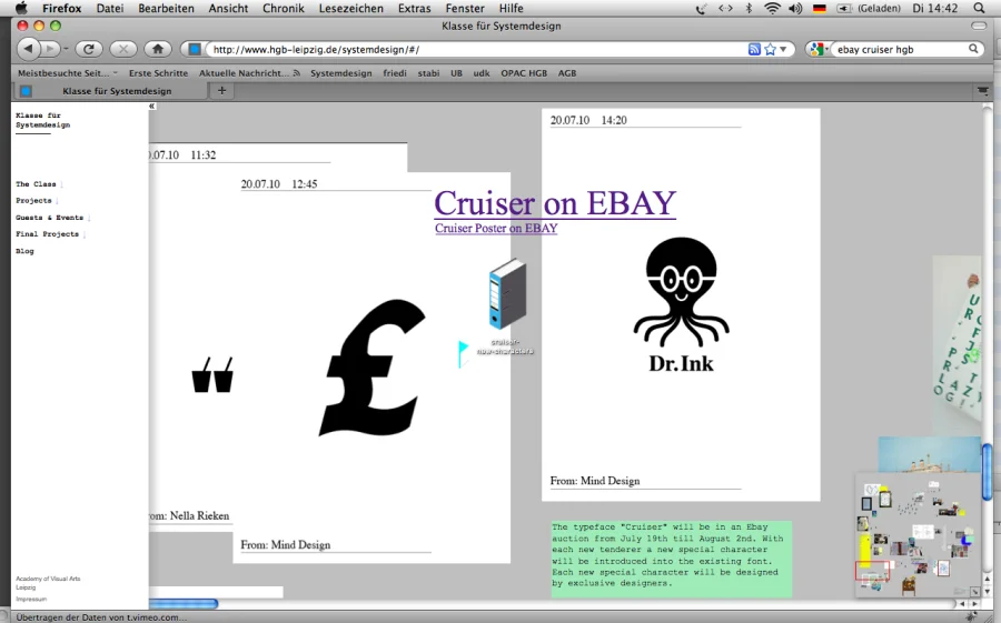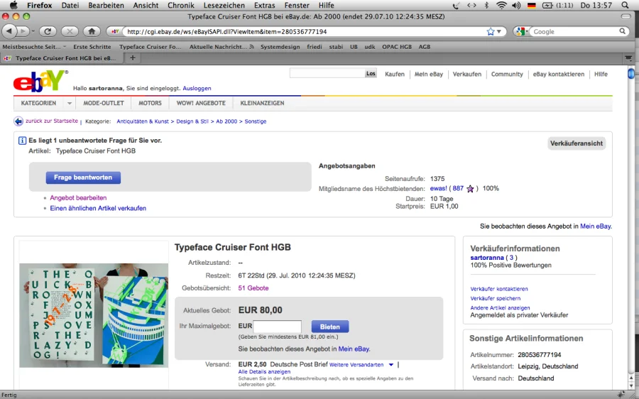 Die Schrift “Cruiser” wird vom 19.7 bis zum 2.8 bei Ebay zum Verkauf angeboten. Die Schrift verändert sich innerhalb der Auktion. Je mehr Bieter und Beobachter es gibt, desto mehr neue Zeichen werden zum Basissatz hinzugefügt.