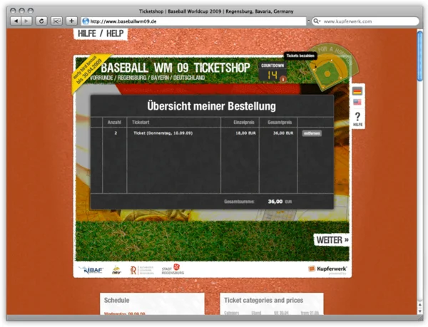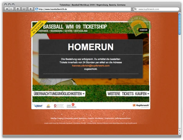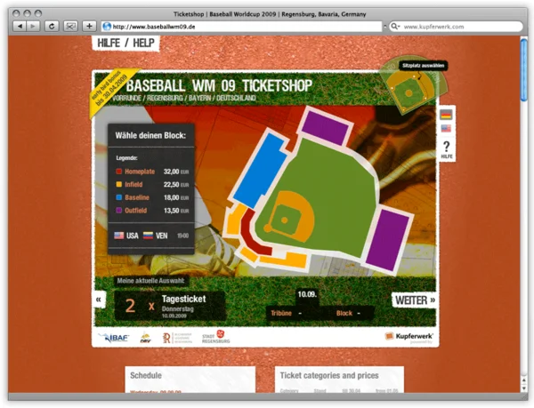 Zur Baseball Weltmeisterschaft, die 2009 in Europa stattfindet, wurde im Online-Markenauftritt des deutschen Austragungsortes Regensburg ein innovativer Ticketshop integriert. Dieser führt den User in einzeln zu durchlaufenden Schritten, welcher der Baseball-Metapher der verschiedenen Bases (1., 2., 3. und Homebase) nachempfunden wurde, durch den Kaufprozess. Innerhalb vier einfach bedienbarer Schritte kann der User sein gewünschtes Ticket aussuchen, den Sitzplatz wählen, die Tickets bezahlen und erhält diese dann per eMail als PDF zugeschickt. In den ersten Wochen wurden über den Ticketshop mehr als 20.000 Tickets (entspricht über 1/4 der Gesamtkapazität) verkauft und bis zur Baseball WM 2009 waren es hierüber fast 30.000 Tickets.