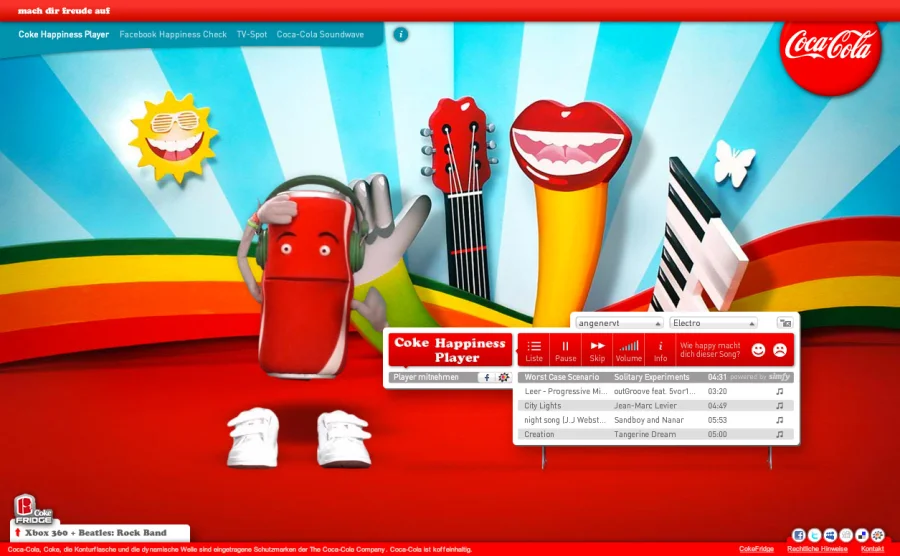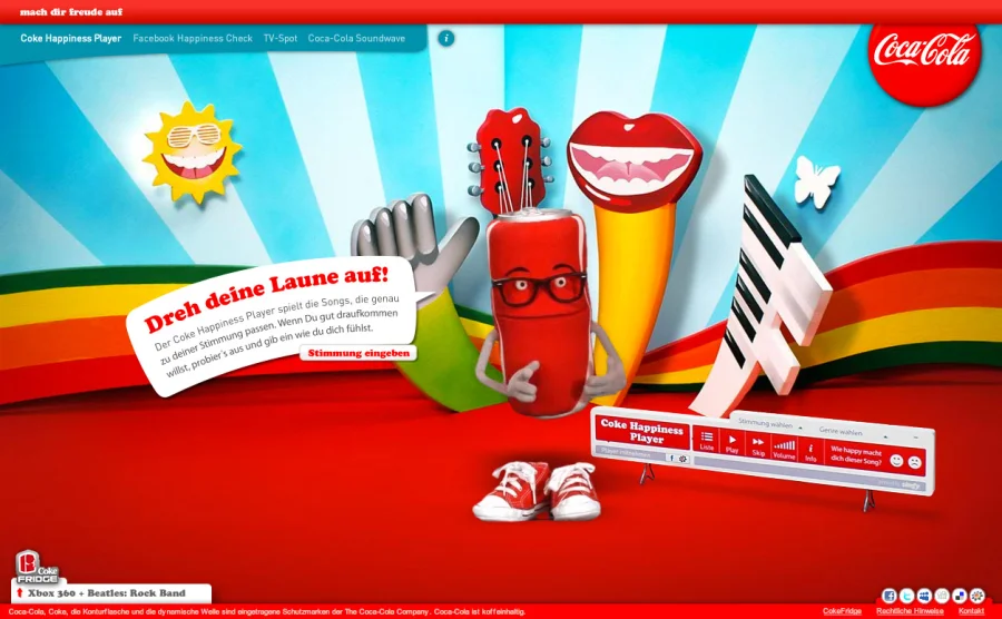 Unter dem Claim “mach dir freude auf” entwickelt Scholz & Volkmer eine integrierte digitale Markenkampagne für Coca-Cola. Kernelement ist der Coke Happiness Player, ein kostenloses Musiktool, welches basierend auf der Stimmungs- und Genreauswahl des Users die passende Musik spielt. Zielgruppe der Kampagne sind Teenager, die mit Hilfe des Tools ihre Gefühle im Web ausdrücken und mit ihren Freunden teilen können. Der Player kann direkt im Onlinespecial genutzt und als Applikation in die persönlichen Facebook- oder StudiVZ-Userprofile mitgenommen werden. Um das Thema emotional zu besetzen, wurde ein neues Testimonial eingeführt: eine sprechende Coke-Dose als Moderator der neuen Music-Show.