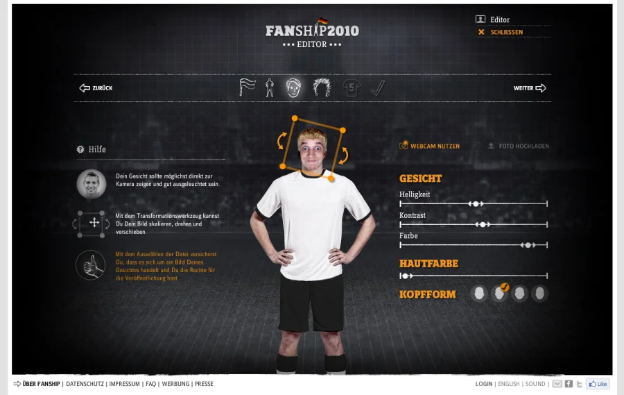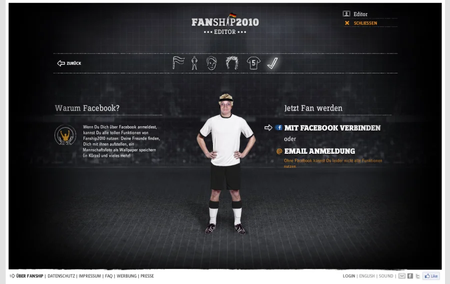 Fanship2010 bietet den Usern die Möglichkeit ein eigenen Fan-Avatar zu erstellen, diesen mit Länderkennung herunterzuladen (Beispielhafte Verwendung: Profilbild in Social-Networks) und in die digitale Fan-Kette einzureihen. Neben der klassischen Registrierung via E-Mail hat der User die Option Facebook Connect zu nutzen.