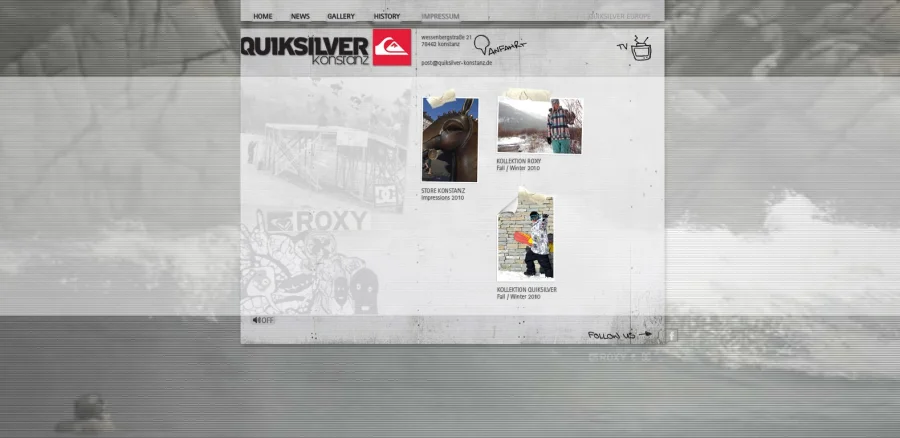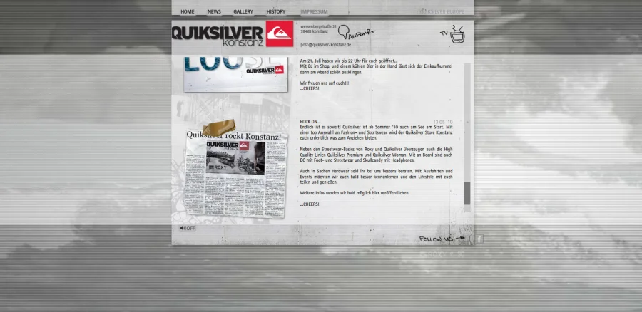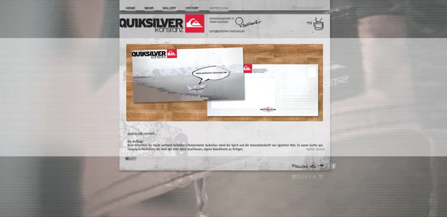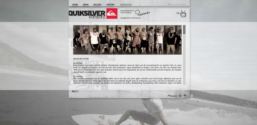 multimediale flashpage mit fullscreen-video-background als digitale visitenkarte eines quiksilver franchise-stores in konstanz.