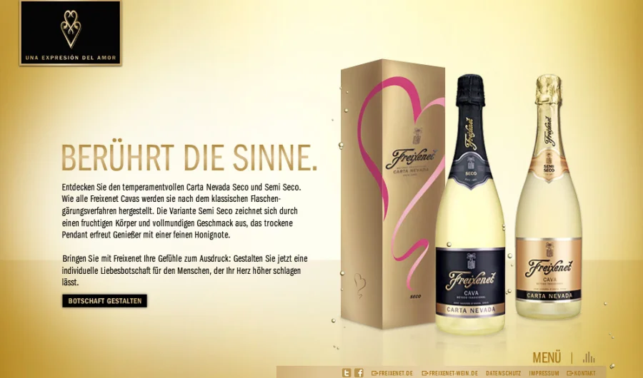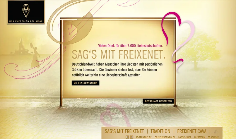 Unter dem Motto „Una expresión del amor – Sag’s mit Freixenet“ konnten User ihre Leidenschaft und Liebe auf dem Webspecial „www.sags-mit-freixenet.de” in Worte fassen und ihre Liebsten mit ihren Botschaften überraschen. Das Onlinespecial ist Kernelement einer integrierten Werbekampagne. Die Grußbotschaften der User konntent am Valentinstag verschickt werden. Aus allen Einsendungen wurden über 100 der schönsten Liebesbotschaften ausgewählt und auf riesigen Plakatflächen veröffentlicht. Die Gewinner konnten ihren Liebsten somit in aller Öffentlichkeit einen unvergesslichen Liebesbeweis erbringen.