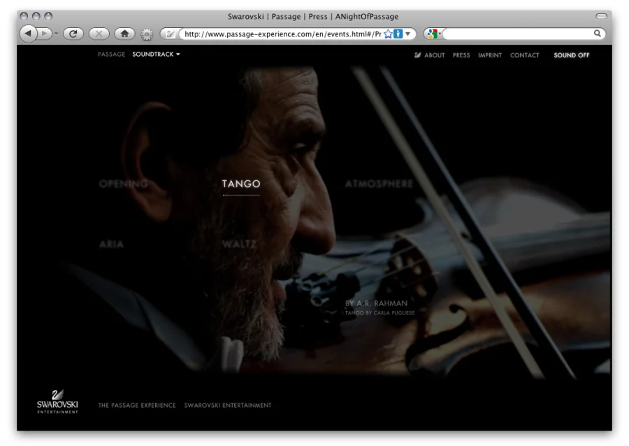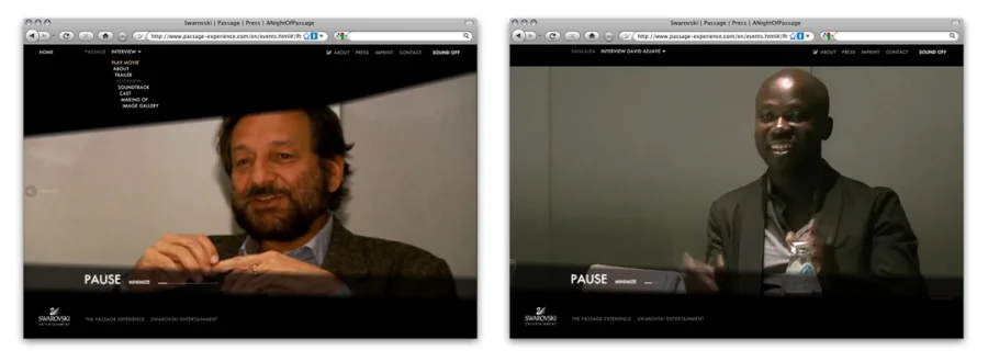 Der User wird während das Navigieren durch Interviews, Soundtracks, Fotos und Videoausschnitten auf das Passage Rahmenprogramm und Live-Screening aufmerksam gemacht.