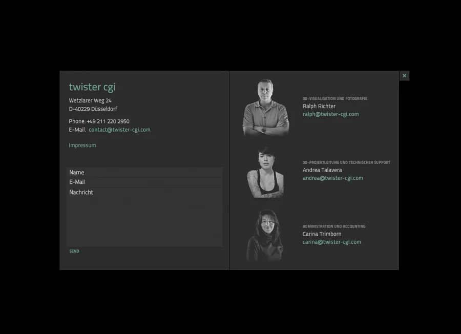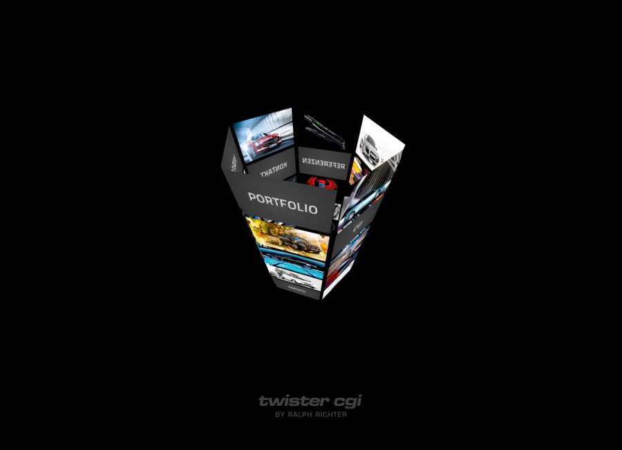 Ich darf unser aktuelles Projekt für den renommierten Fotografen Ralph Richter vorstellen. Mit seinem Unternehmen ‘twister cgi’ generiert er atemberaubende 3D-Bilder für internationale Kunden und Marken. Genauso außergewöhnlich wie die Arbeiten von ‘twister cgi’ sollte die Image-Website werden. Wir nahmen den Firmennamen wörtlich und entwickelten daraus ein auf Flash (AS3) und Papervision basierendes Navigationskonzept. Die komplette 2-sprachige Website wird über ein individuell von uns programmiertes Content-Management-System durch den Kunden selber verwaltet.
