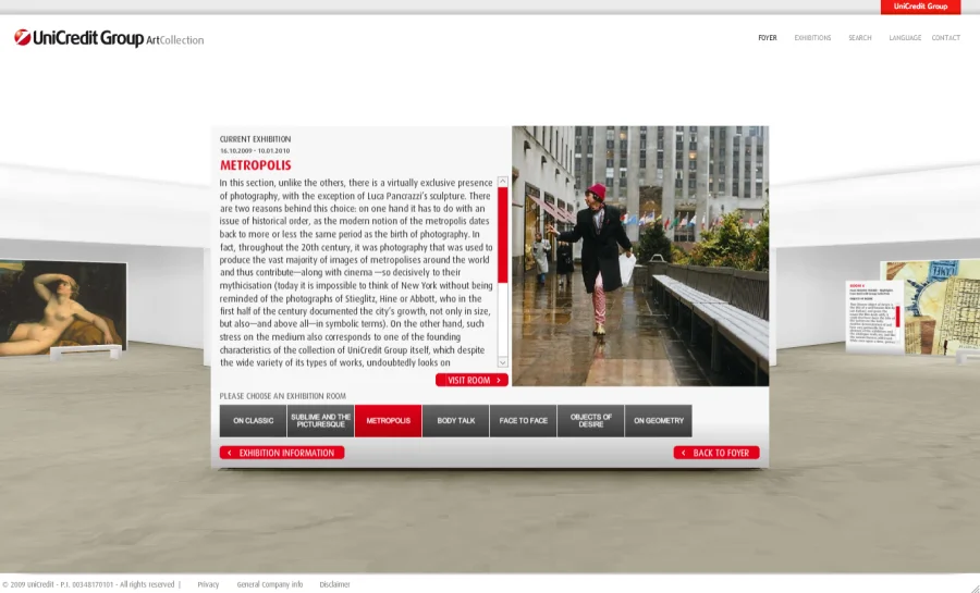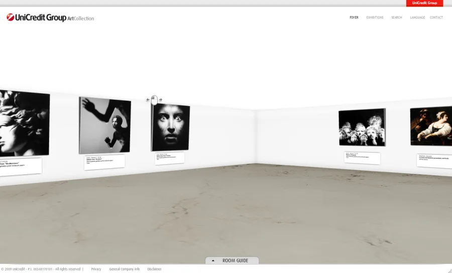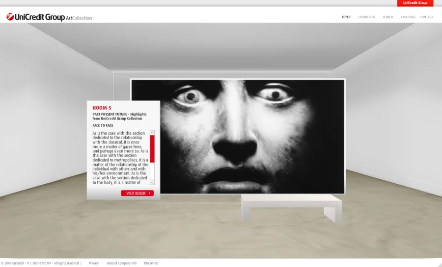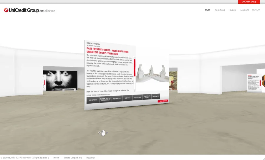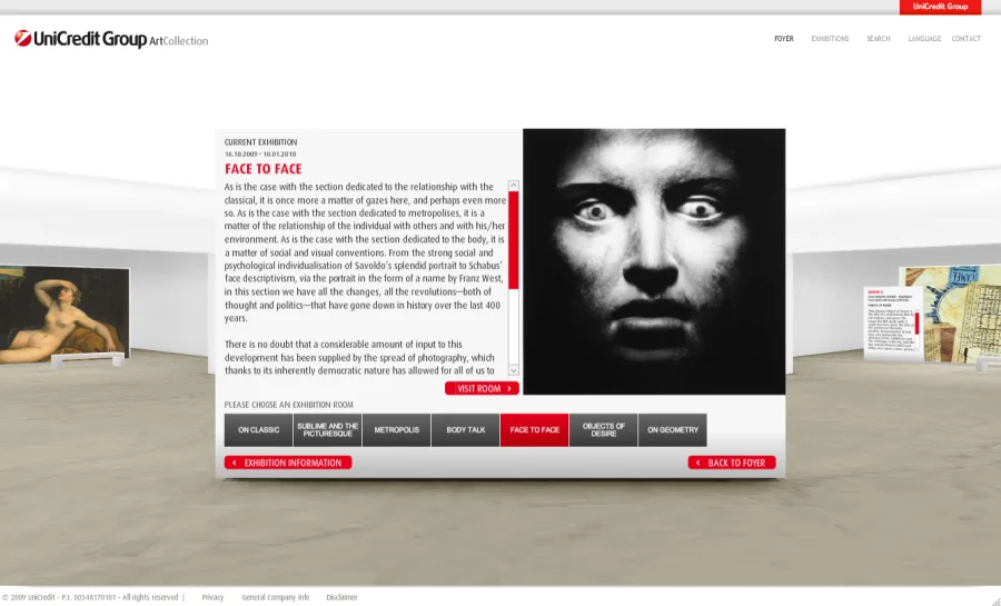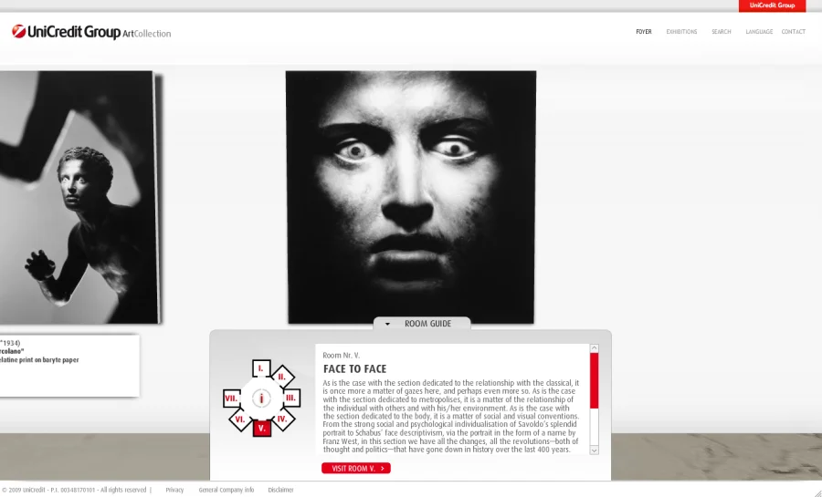 UniCredit Group präsentiert Kunstausstellung online!Der Besucher wird in eine virtuelle Erlebniswelt entführt. Er geht von Raum zu Raum, betrachtet die Kunst, liest detaillierte Informationen über die einzelnen Werke. Die Website zeigt die Möglichkeiten und Wirkung von voll-dynamischen 3D-Darstellungen. „Die Website ist eine virtuelle Erlebniswelt für Kunstliebhaber!“