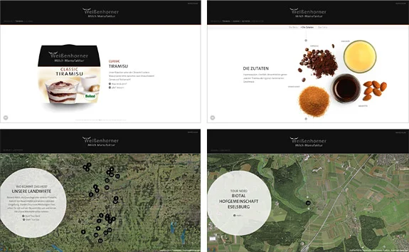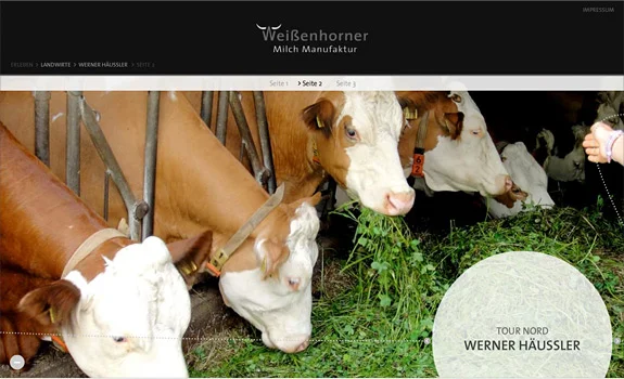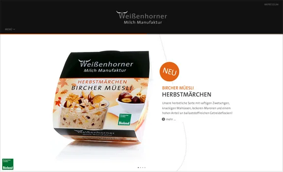 Für die Bio-Marke Weißenhorner gestaltete und produzierte Zum Kuckuck die neue Website der Milch Manufaktur aus dem Allgäu. Der Hersteller hochwertiger Molkereiprodukte steht für Qualität, Natürlichkeit und Transparenz – das vermittelt auch die Internetpräsenz: mit einer klaren Produktdarstellung, 360°-Ansichten und dem Offenlegen der Zutaten als Fotos unter der Frage „Was ist da drin?“. Auf der Milchwagen-Tour via Google Maps erfährt der User, woher Weißenhorner die Bioland-Milch für seine Produkte bezieht. Dabei lernt er über authentische Fotostrecken auch die Landwirte samt Familie kennen. Die Linie als zentrales Gestaltungs-Element vernetzt alle Inhalte und leitet durch die Weißenhorner Welt.