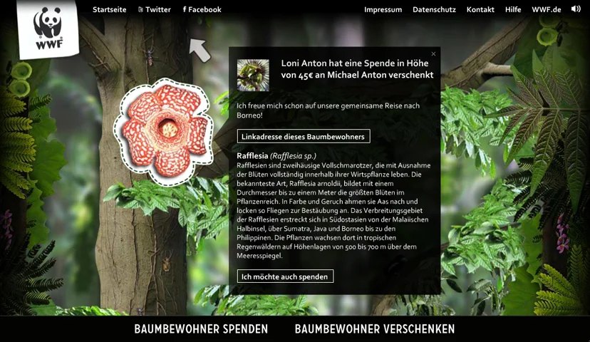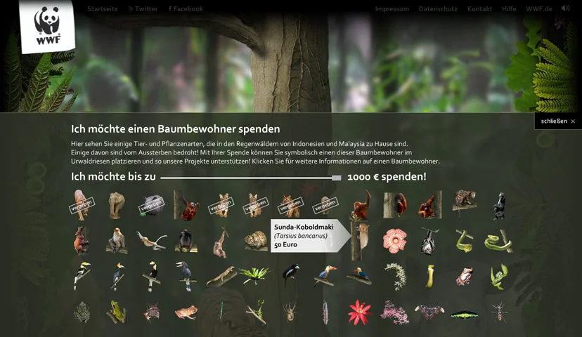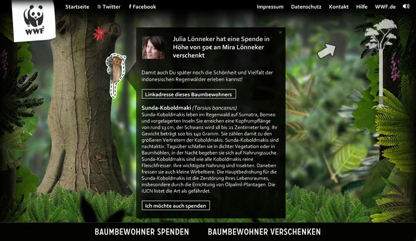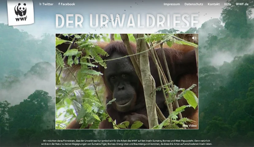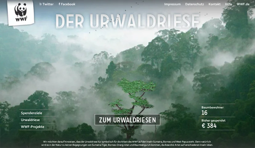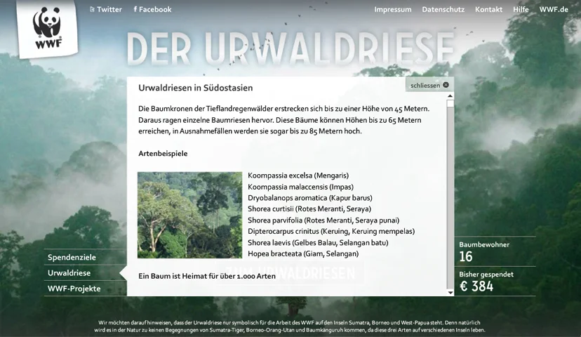 Der WWF und zweipol haben für die Spenden-Aktion “Der Urwaldriese” gemeinsam eine neue Flash-Microsite mit Social-Media-Anbindung entwickelt. Jeder kann sich für Spenden von drei bis eintausend Euro ein Tier oder eine Pflanze aussuchen und – mit Namen und eigenen Beweggründen oder Kommentaren versehen – in einem virtuellen Baum platzieren. Je mehr Menschen spenden, desto größer wird der Baum. Mit jeder Spende trägt der Anwender dazu bei, die Artenvielfalt im indonesischen Urwald symbolisch zu vergrößern und in der Realität zu sichern. Die Spenden werden in einer informativen und unterhaltsamen Umgebung eingeworben, die das Ziel der Kampagne aufgreift und visualisiert.