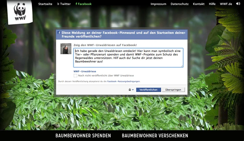 Beim Klick auf die Tier- oder Pflanzenart werden Informationen zur Flora oder Fauna angezeigt. Der Spender kann seinen Namen und sein Foto hochladen und einen Kommentar abgeben. Wer möchte, kann auch anonym bleiben. Anschließend kann man sein Tier oder seine Pflanze per Twitter oder Facebook verschicken oder die Kampagne selbst auch über diese Social-Media-Kanäle verlinken. So verbreitet sich die Spendenkampagne innerhalb der Zielgruppe weiter. Wer möchte, kann eine Spende auch an Freunde oder Angehörige verschenken.