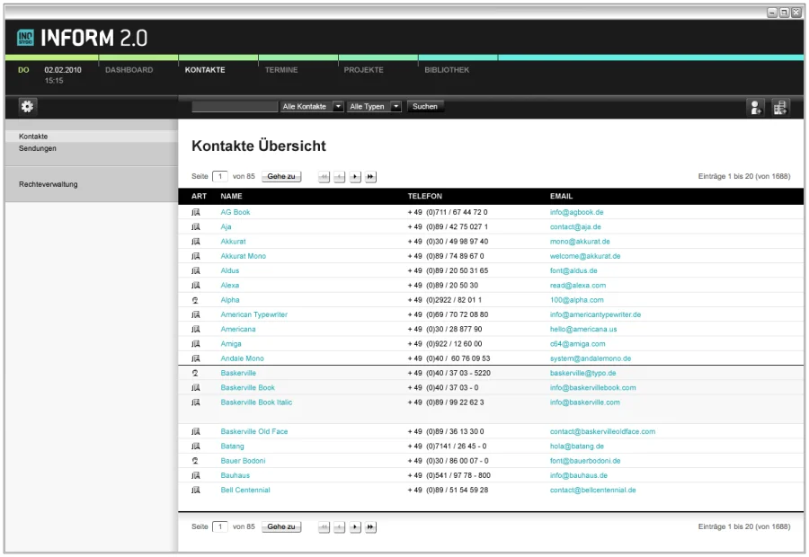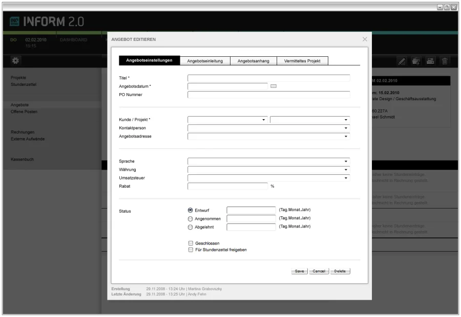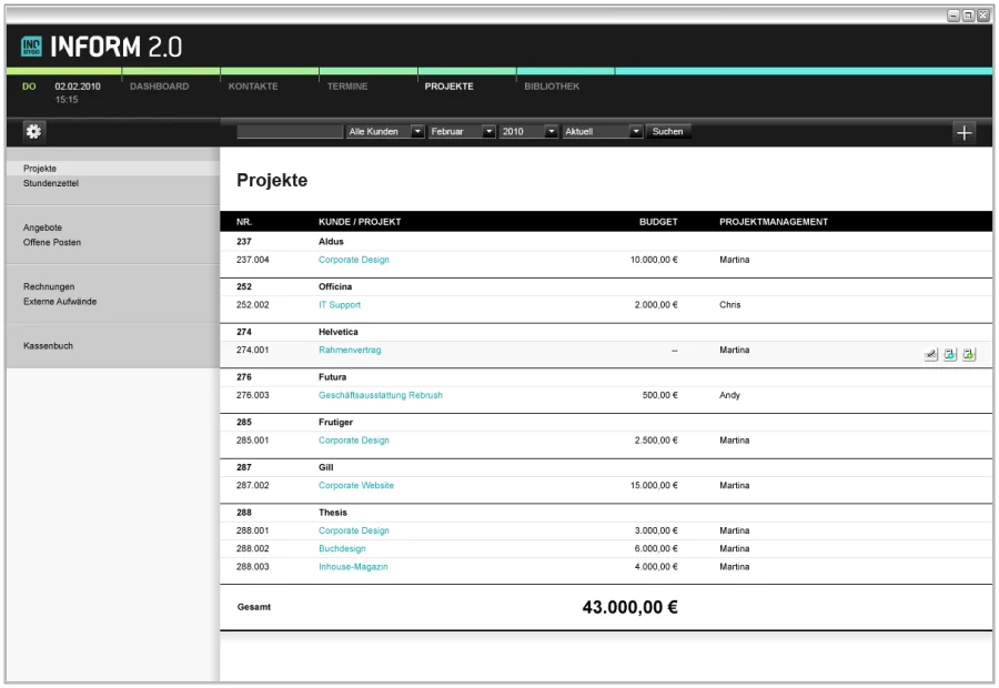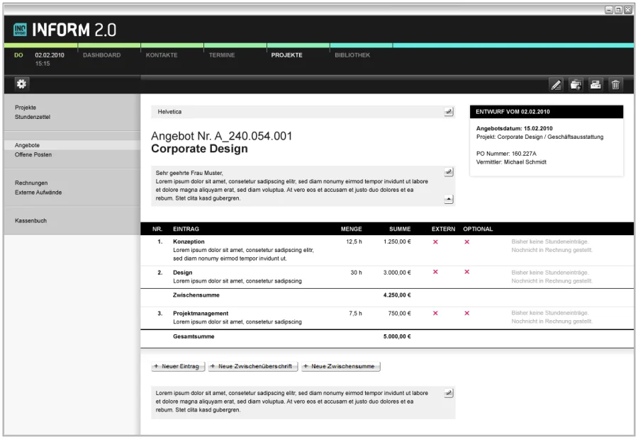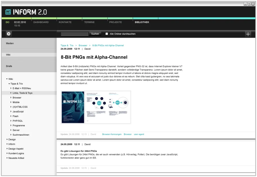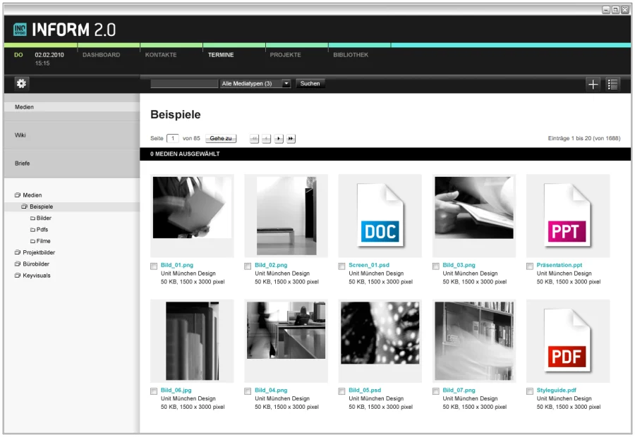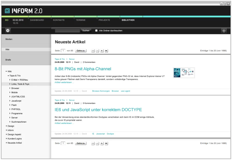 Arbeit kann so schön sein! Die Informations- und Projektverwaltungslösung Inostudio Inform 2.0 unterstützt die Projektarbeit in kreativ arbeitenden Unternehmen wie z.B. Werbe-, Event-, Webagenturen, Postproduktionen, Foto-, Film- und Tonstudios als webbasierte Anwendung mit Projekt- u. Dokumentenverwaltung, Kontakte, Termine, Wissensmanagement und vieles mehr.
