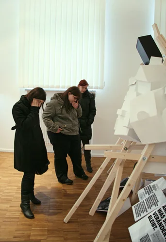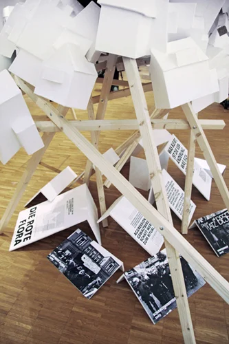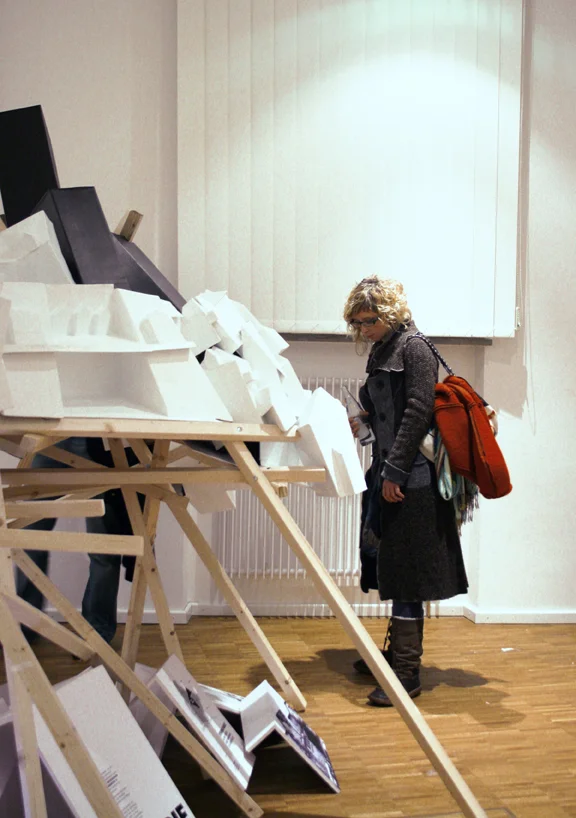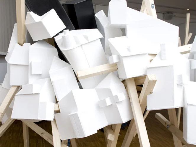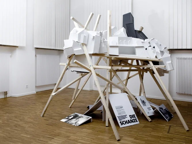 Schief und krumm werfen sich die Wände in die Luft, wuchtig wirken die Fassaden, als könnten sie jede Katastrophe überstehen. Mit ihren verzerrten Flächen und verkehrten Kanten wirken die Gebäude des Stadtteilmodells dennoch irgendwie verletzt. Nie heil. Sie sind die perfekten Abbilder des Wandels – einer Zeit, in der nichts mehr gerade verläuft. Die Häuserlandschaft aus Kartonagen wird von einer Holzkonstruktion getragen, die ebenso zerbrechlich und unstabil wirkt.