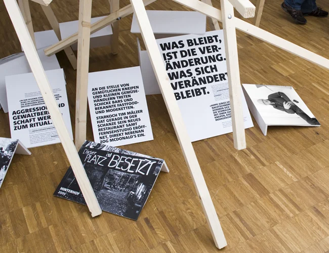 Informationen zu aktuellen Geschehnissen und wichtigen historischen Ereignissen innerhalb des Viertels bieten Bodenplatten. Der Betrachter erhält durch starke Headlines und klare Typografie schnellen Zugang in die Thematik. Als Besonderheit dient eine der Bodenplatten als Projektionsfläche, auf der Interviews von Menschen, gezeigt werden die sehr stark mit dem Viertel verwurzelt sind.