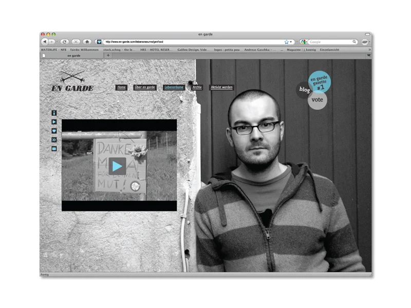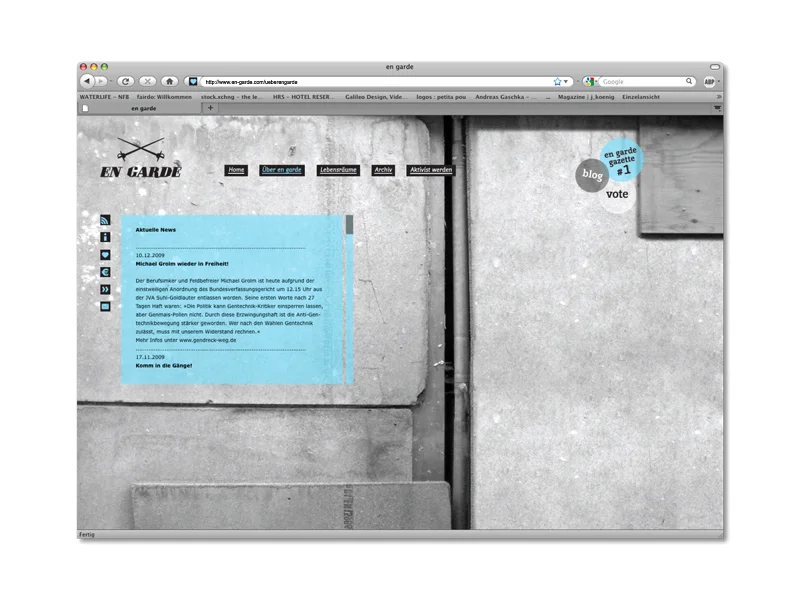 In meiner Masterarbeit stelle ich Organisationen und Menschen vor, die uns zeigen, dass Gegenentwürfe zu den vorherrschenden gesellschaftlichen Verhältnissen möglich sind. Hierzu entstand die Plattform »en garde«: eine Initiative, ein Appell, eine Unterstützung in Form eines Magazins und einer Website. Meine Arbeit widmet sich all jenen, die mit voller Hingabe ihre Ideale und Überzeugungen leben und sie ist eine Hommage an alle Aktivisten und ihren Kampf. Gerade in den letzten Jahren entstanden unglaublich viele neue und kreative Aktionsformen und subversive Gruppierungen. Oft mit einer Regelübertretung, also Zivilem Ungehorsam verbunden, erregen sie in einem hohen Maße die öffentliche Aufmerksamkeit. Diesen Menschen will ich mit »en garde« ein Sprachrohr bieten, um ihre Ideen und Aktionen zu verbreiten und von der Öffentlichkeit gehört zu werden.