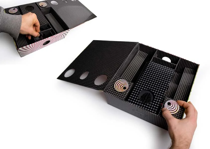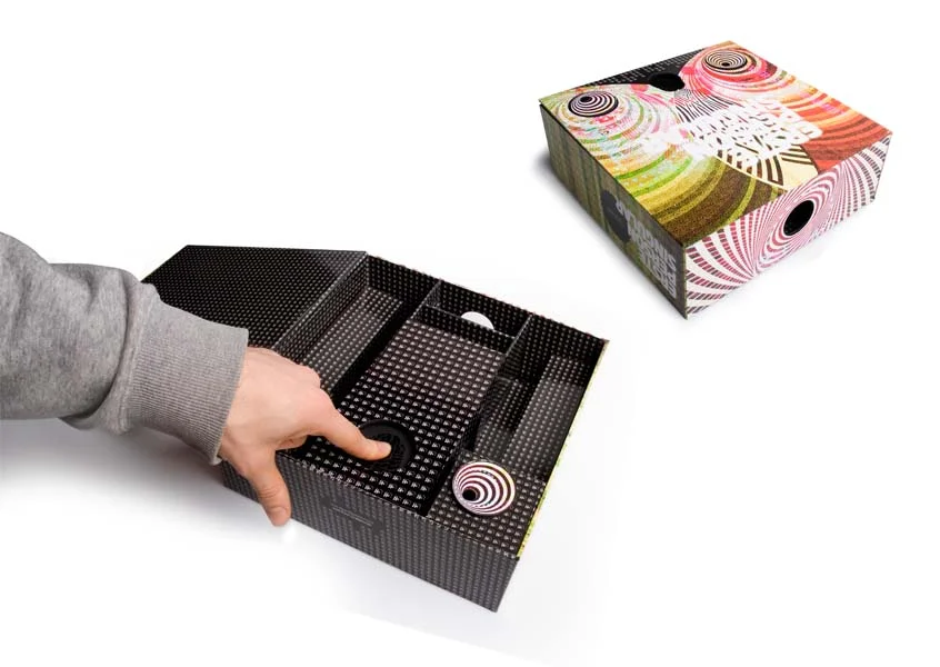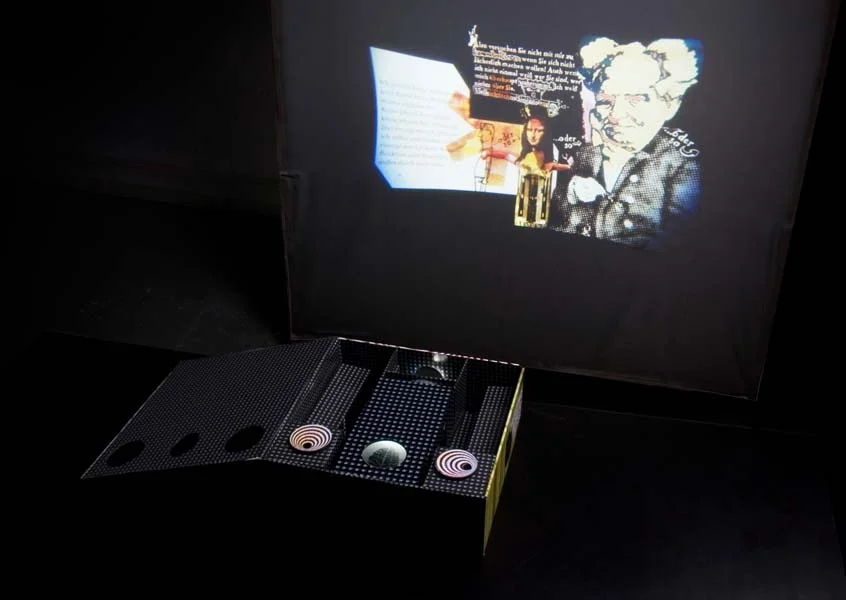 Der Pappprojektor beinhaltet nun den 68-seitigen gedanklichen Monolog auf einem Diafilm, ein Linsensystem, 4 Mono-Zellen und eine 3-Watt-LED-Birne. Der Betrachter kann die Pappschachtel selbsthändig ein- und ausschalten, den Fokus einstellen und den Diafilm spulen.